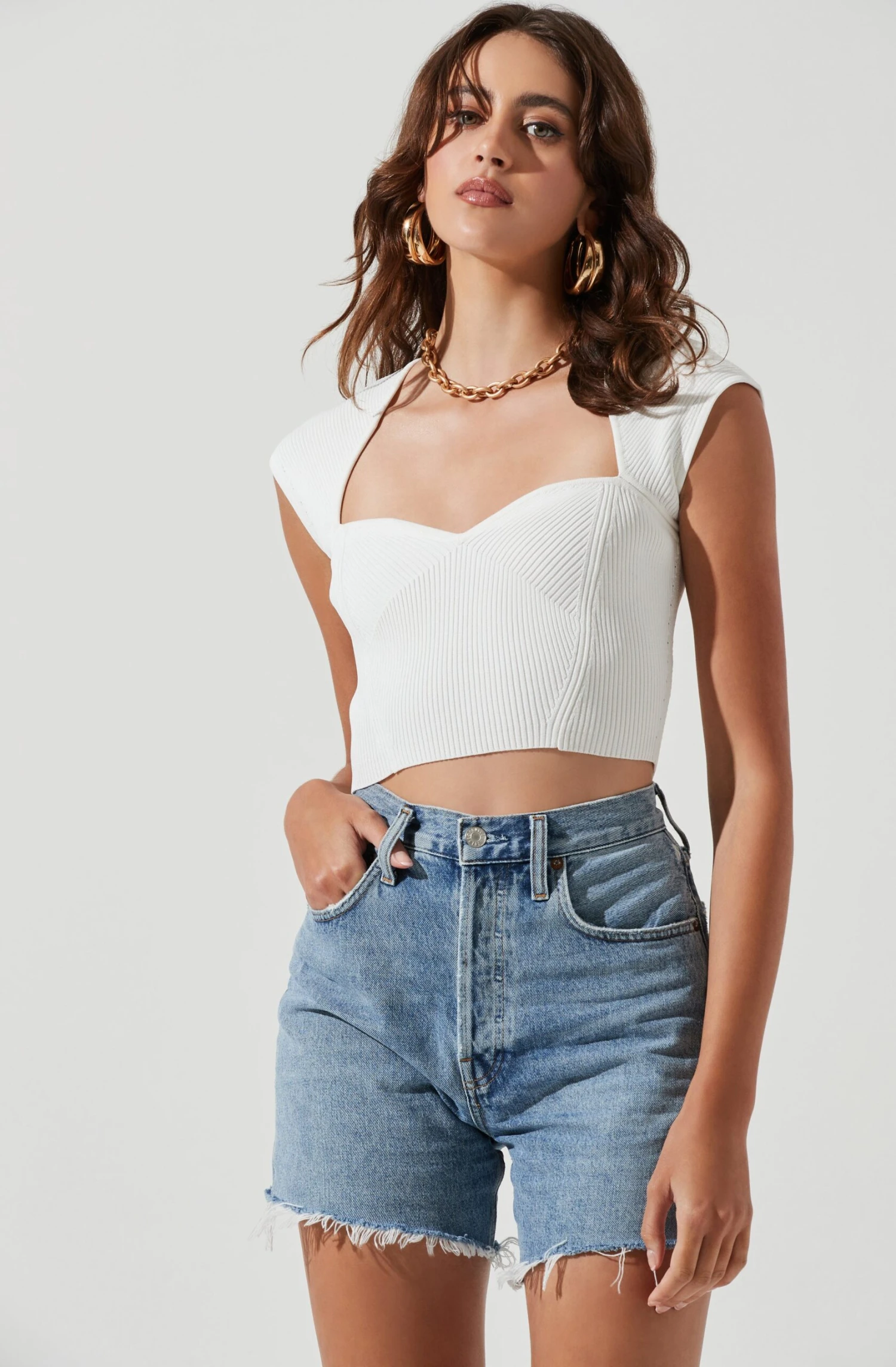 This knit top features a sweetheart neckline and cap sleeves. Directional knit design along the bodice with a darted bust. Cropped. Slight stretch.