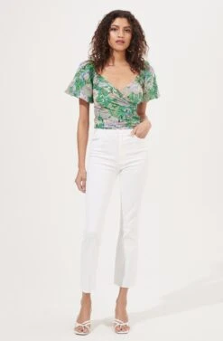 Let’s get tropical this summer! The Belize Top features a scoop neckline with a ruffle trim and short flutter sleeves. Front tie accent leads to a button down bodice with a slight flare. Bright and cheerful tropical print throughout.