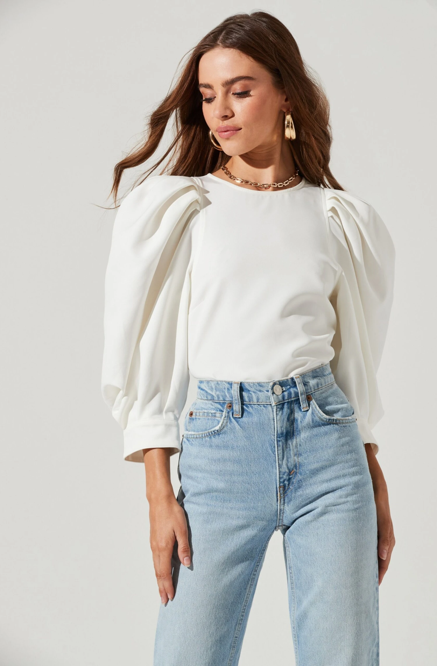 This top features a crew neckline with statement bubble half sleeves. Concealed back zip closure.