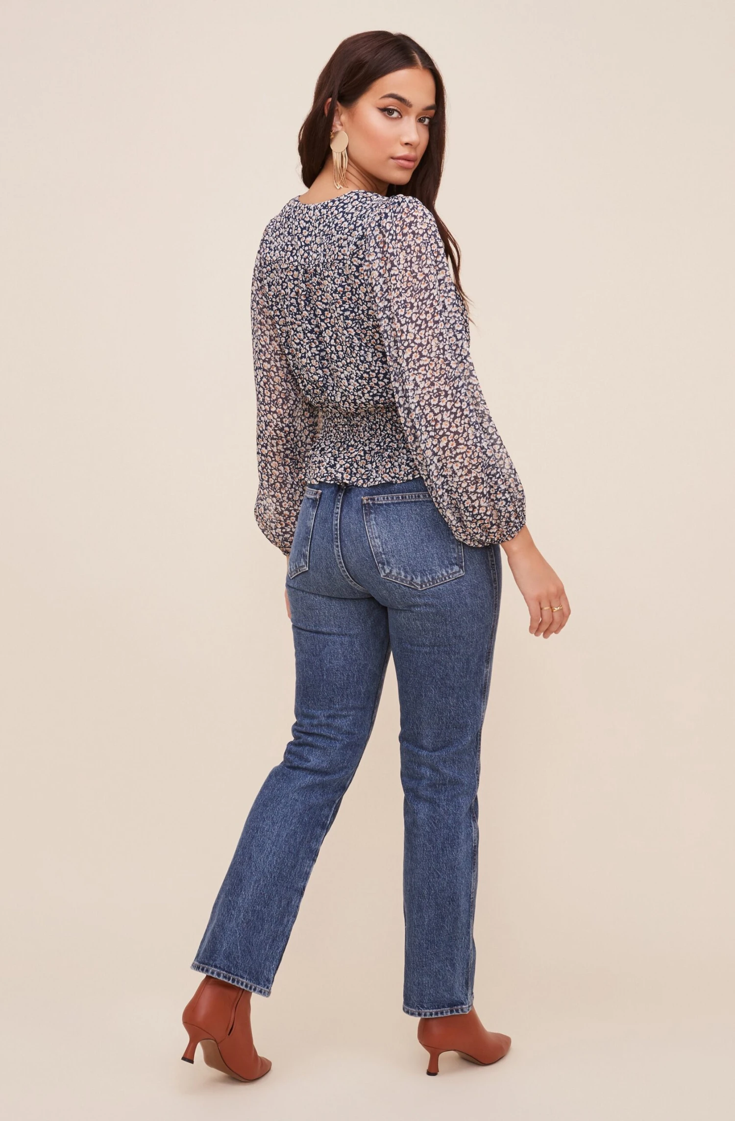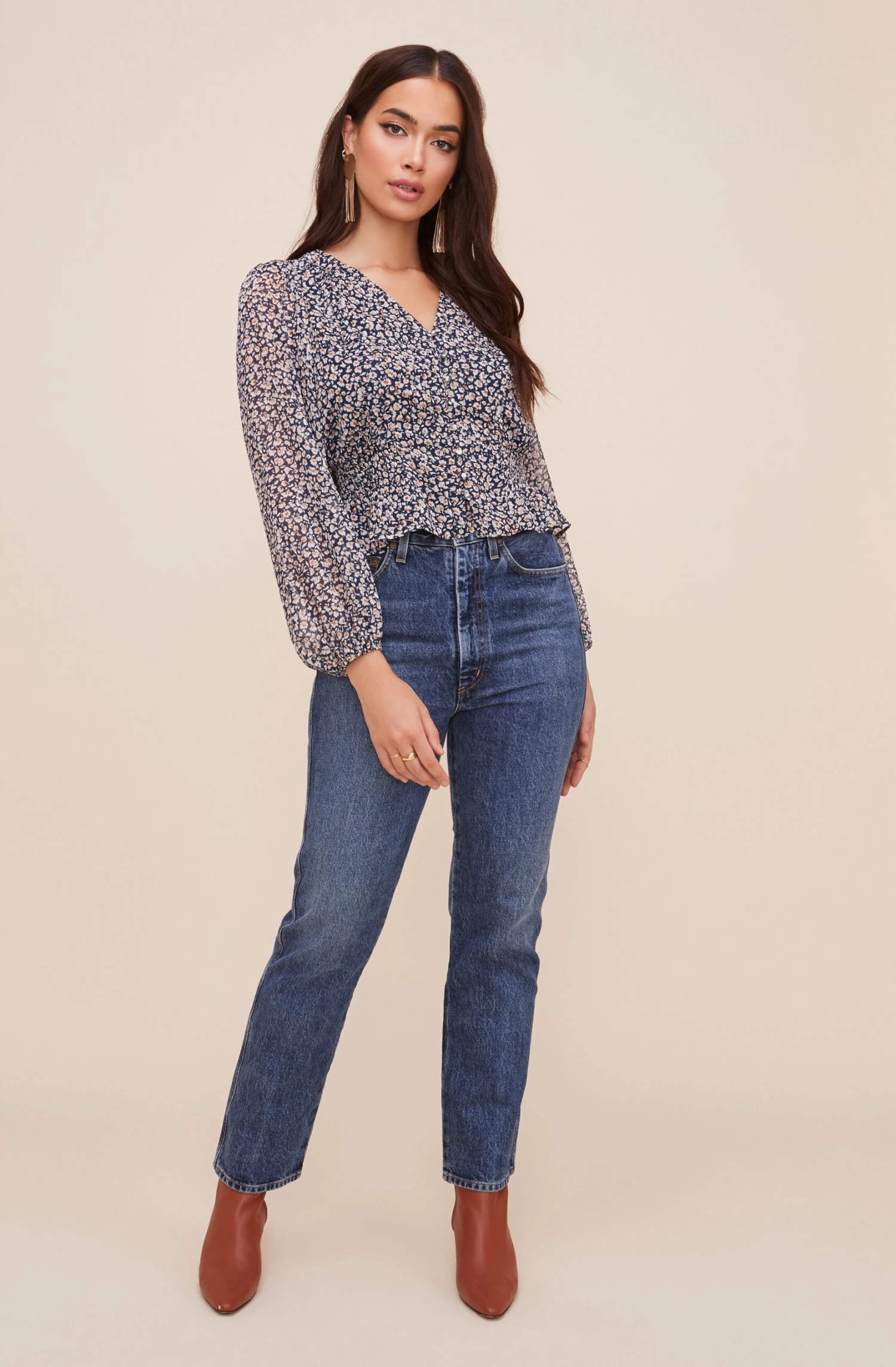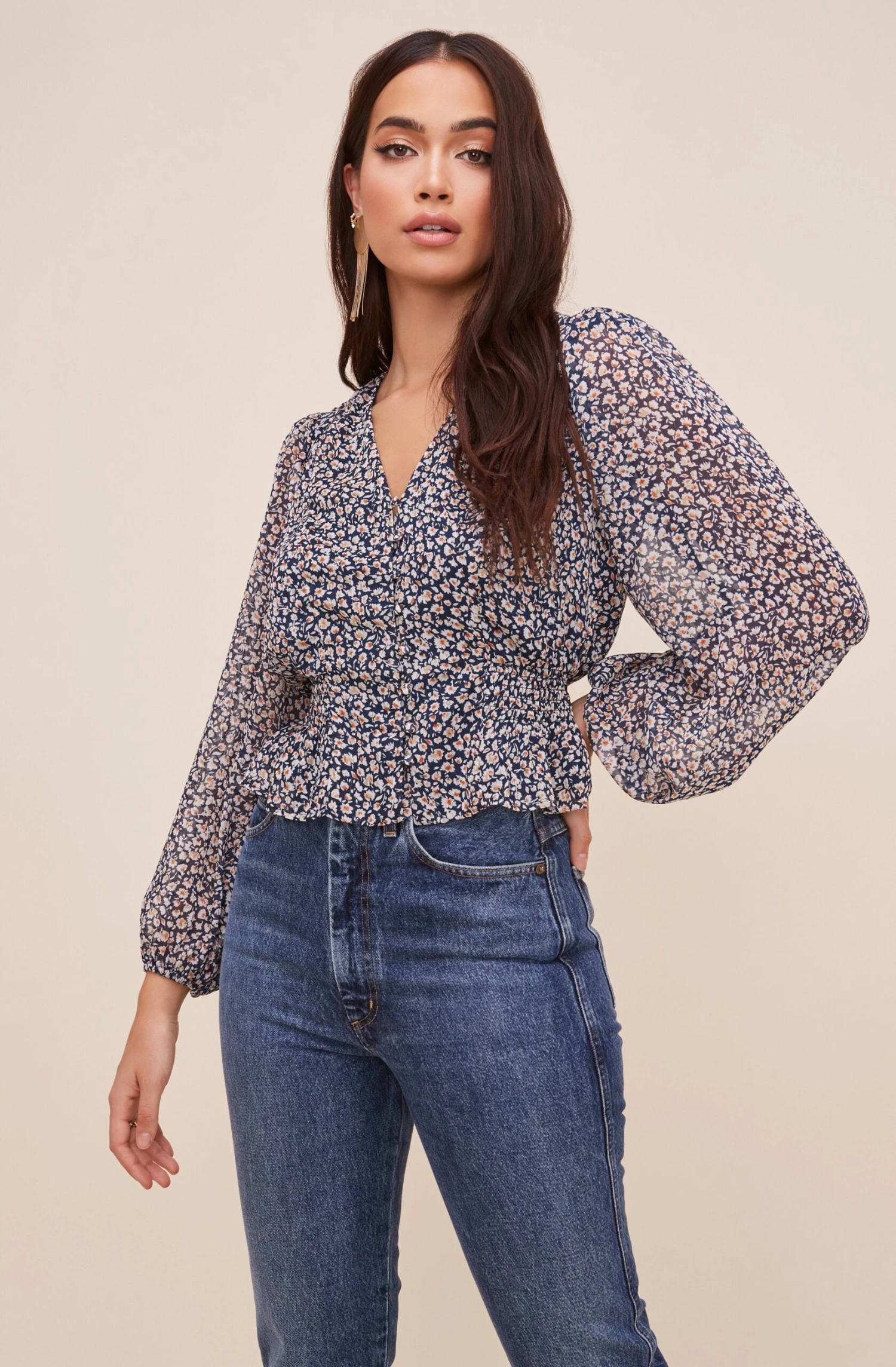 A sweet style made to show off. This floral top features a V neckline that descends to a buttoned front and peplum hem. Long puff sleeves and ditzy floral print throughout.