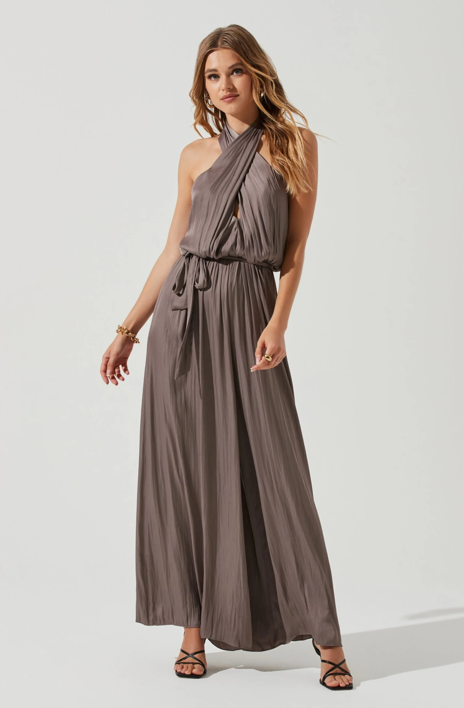 The Cheryl Jumpsuit features a cross-strap halter neckline that leads to a pleated front and loose-fitting bodice. Tie waist leads to wide leg bottoms. Open back.
