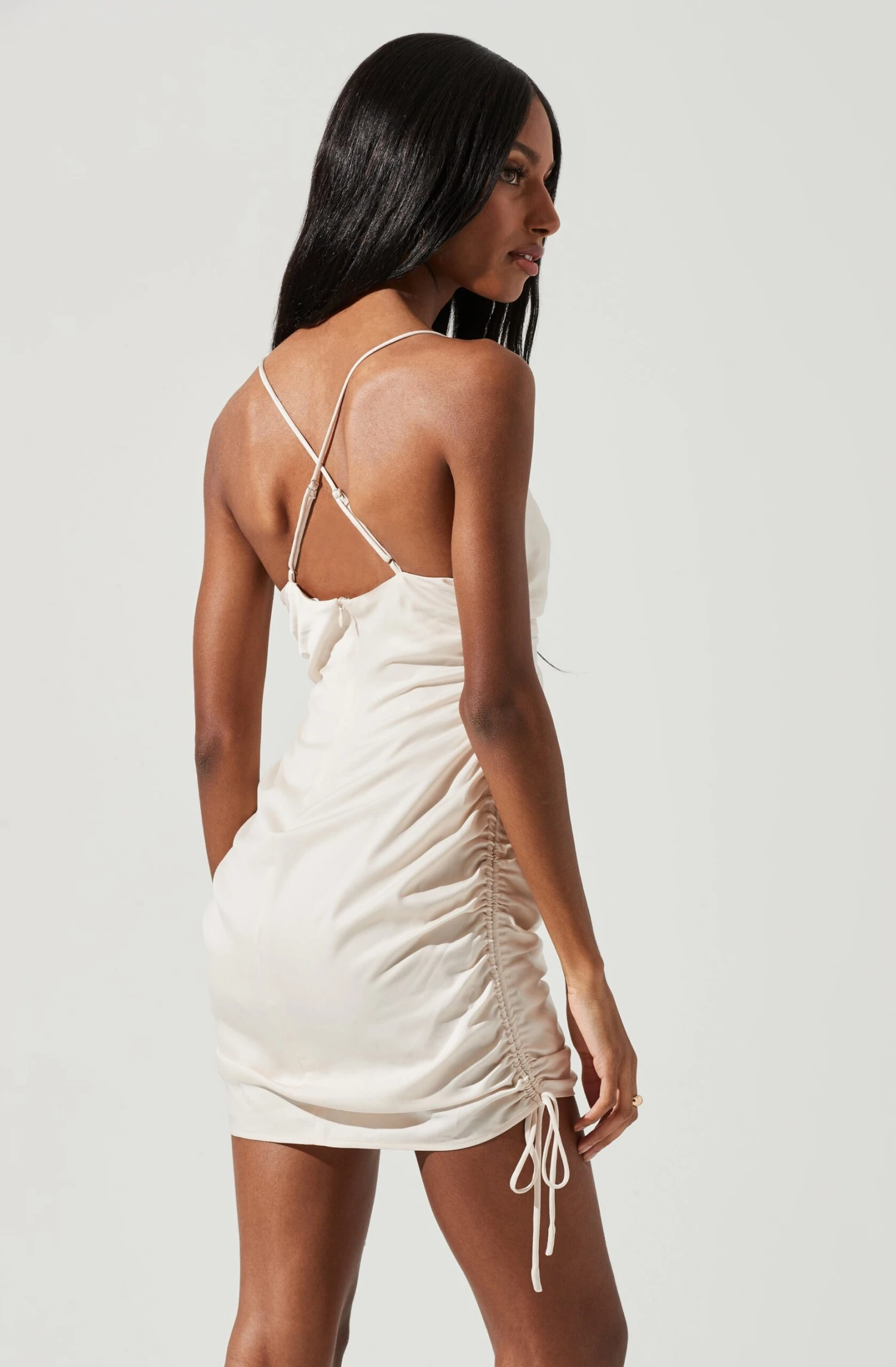 The Claire Dress features a cowl neckline that leads to a ruched silhouette and drawstring accents. Adjustable cross straps. Concealed back zip closure.