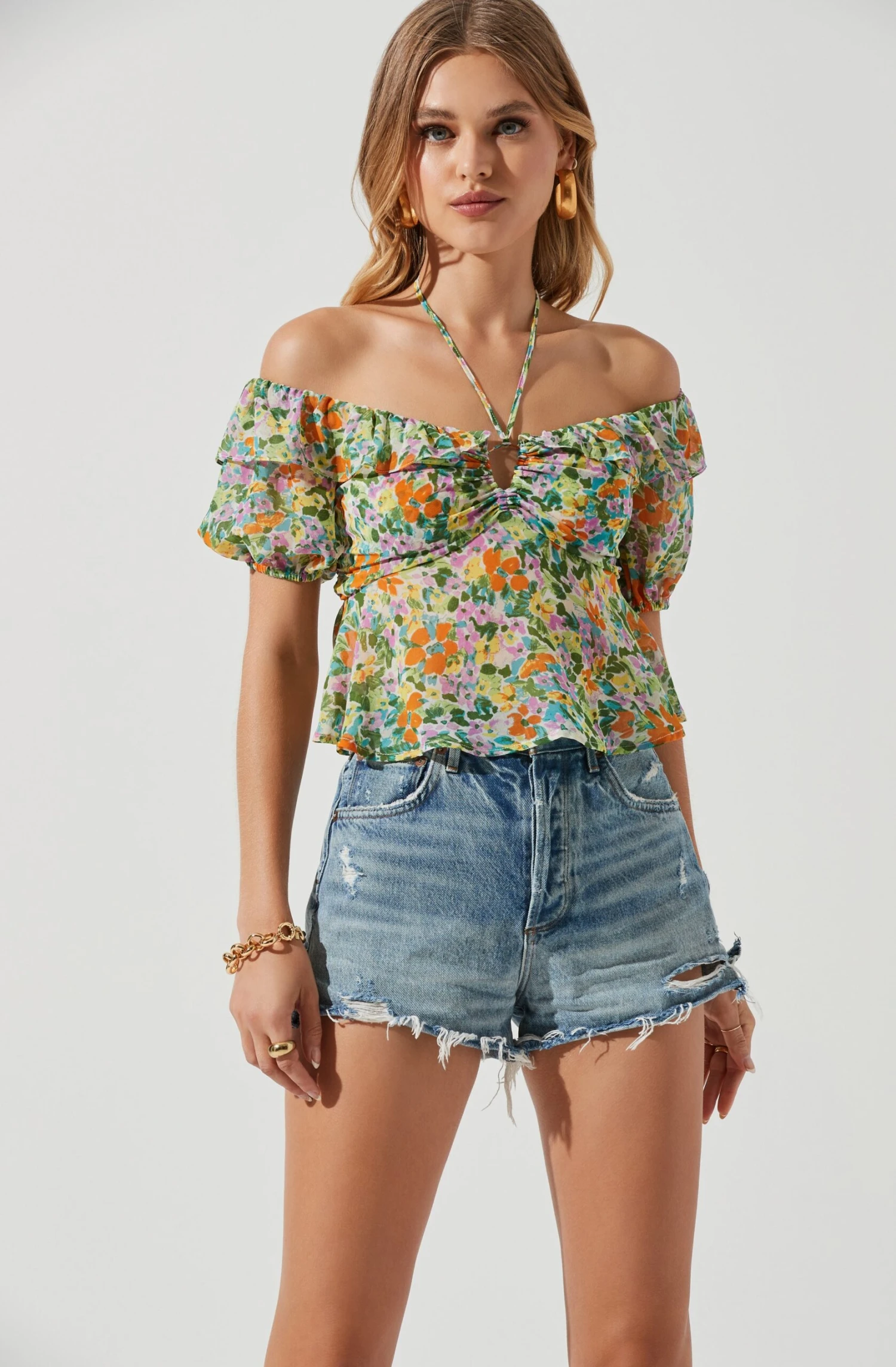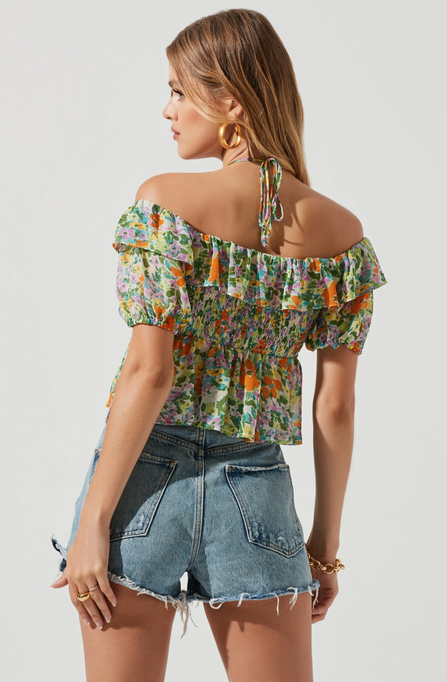 SKU: YXN0C 1695267243 Category: Tops Tags: 22.06COLL, BRUNCH, Garden party, SHOPALL, Vacation, Vt::Tops::Neckline::Halter, Vt::Tops::Neckline::Off Shoulder, Vt::Tops::Pattern::Floral, Vt::Tops::Sleeve Length::Short Sleeve, Weekend