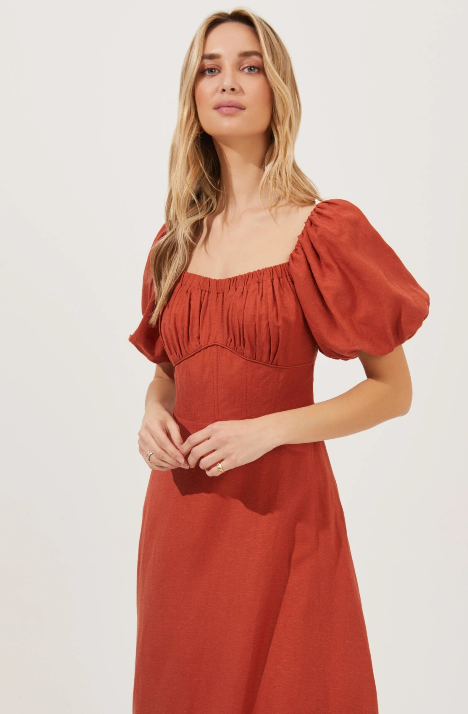 The Darcy dress features a square neckline with a shirred bustier front and darted bodice. Short puff sleeves. Smocked back. Midi skirt.