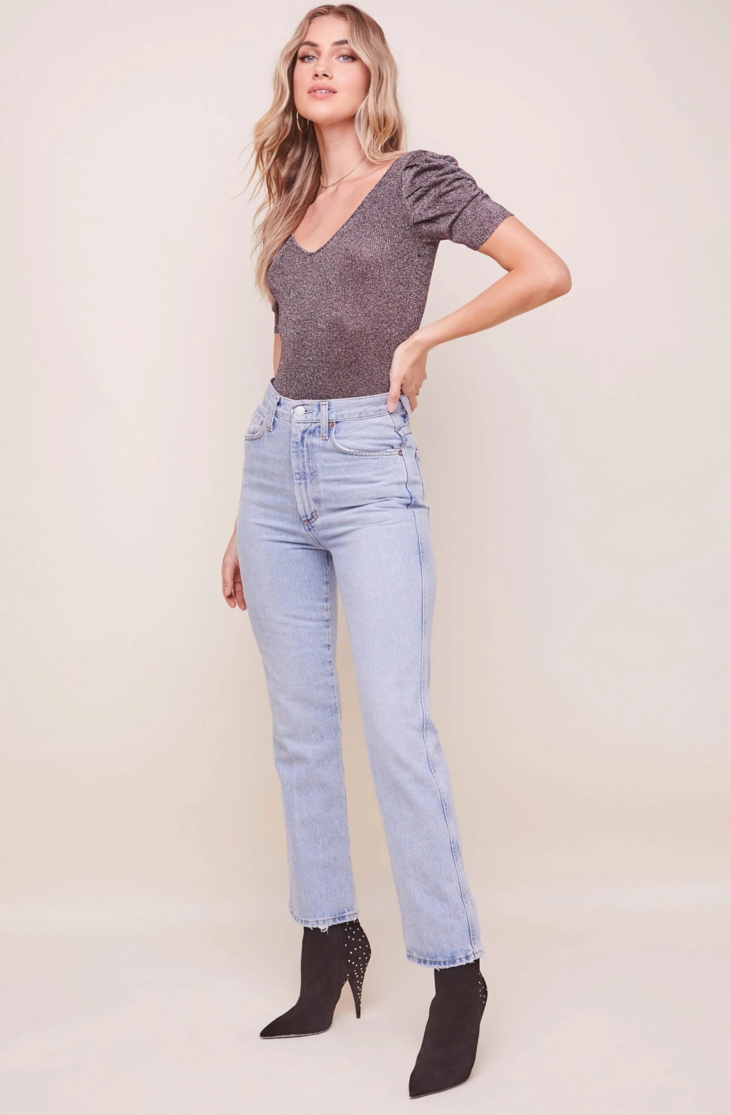 Nothing says fun like metallic bodysuits! The Deidra features a V neckline, ruched, puff sleeves and a fitted bodice.
