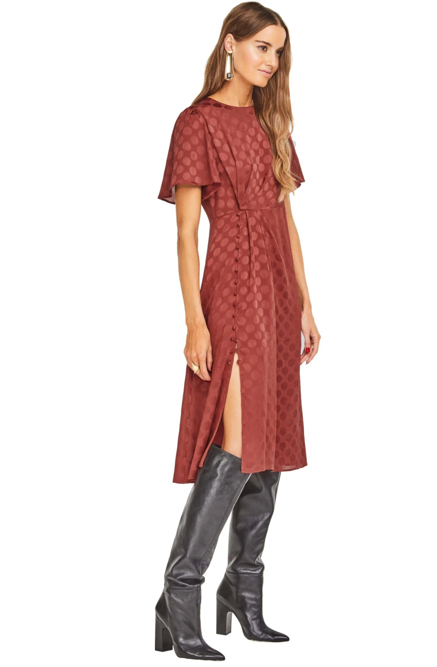 100% Viscose, Length: 46 7/8″ (Size M), Hook + Eye Closure, Dry Clean Only, Midi Dress, Flutter Sleeve, Button, Model is Wearing Size S, Model’s Measurements: Height 5’10” // Bust 34″ // Waist 24″ // Hips 34″, Fits True to Size, Style#ACDR95382