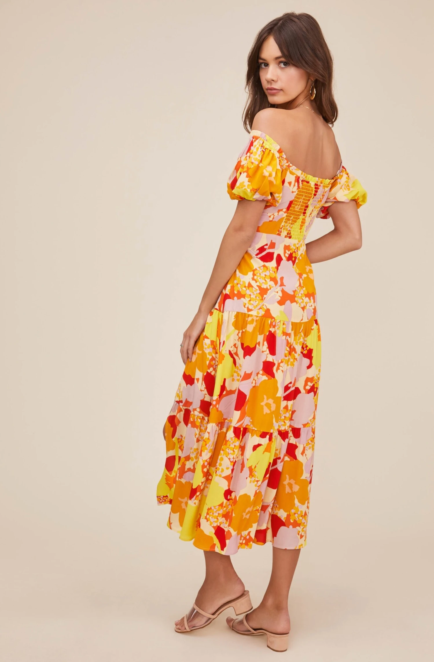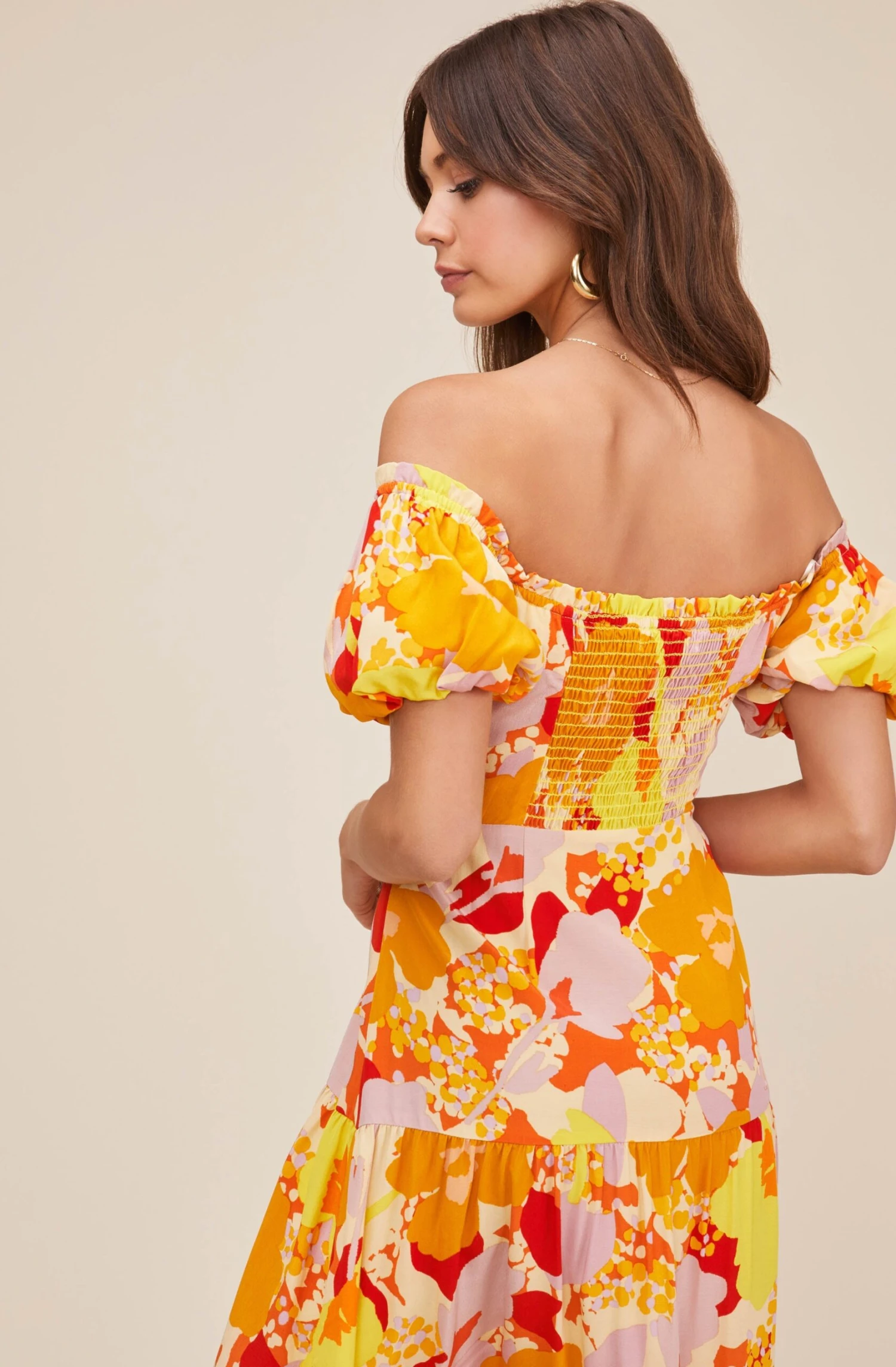 When the tropic calls, answer it with the Etta Dress! This style features an off-shoulder neckline that leads to a darted bodice that accentuates your waist. Flowy midi skirt features a sexy front slit accent. Bright and cheerful tropical print throughout. Short puff sleeves.