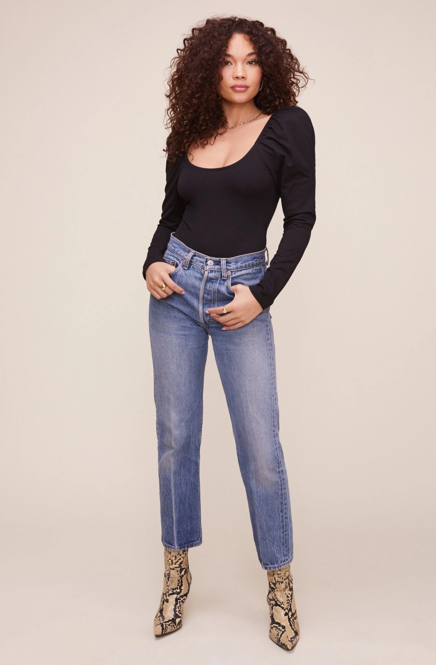 Femme vibes all the way! The Fatima bodysuit features a scoop neckline that leads to a flattering and fitted bodice. Statement puff shoulders lead to fitted long sleeves. Scoop back.
