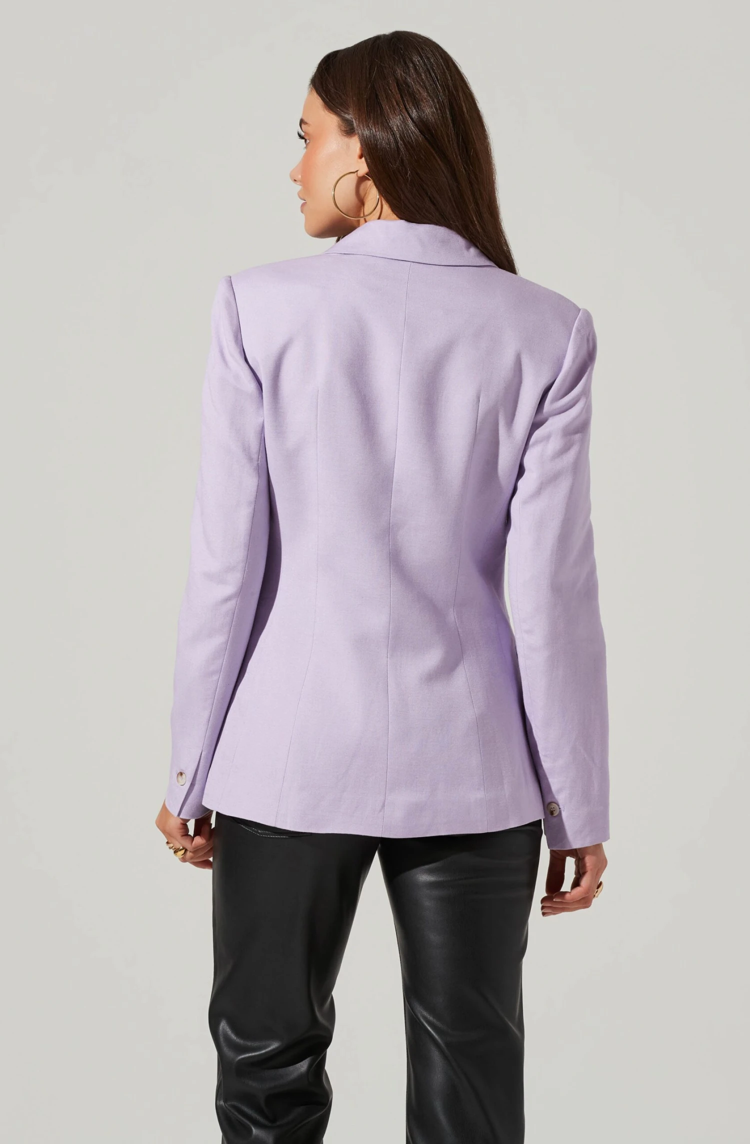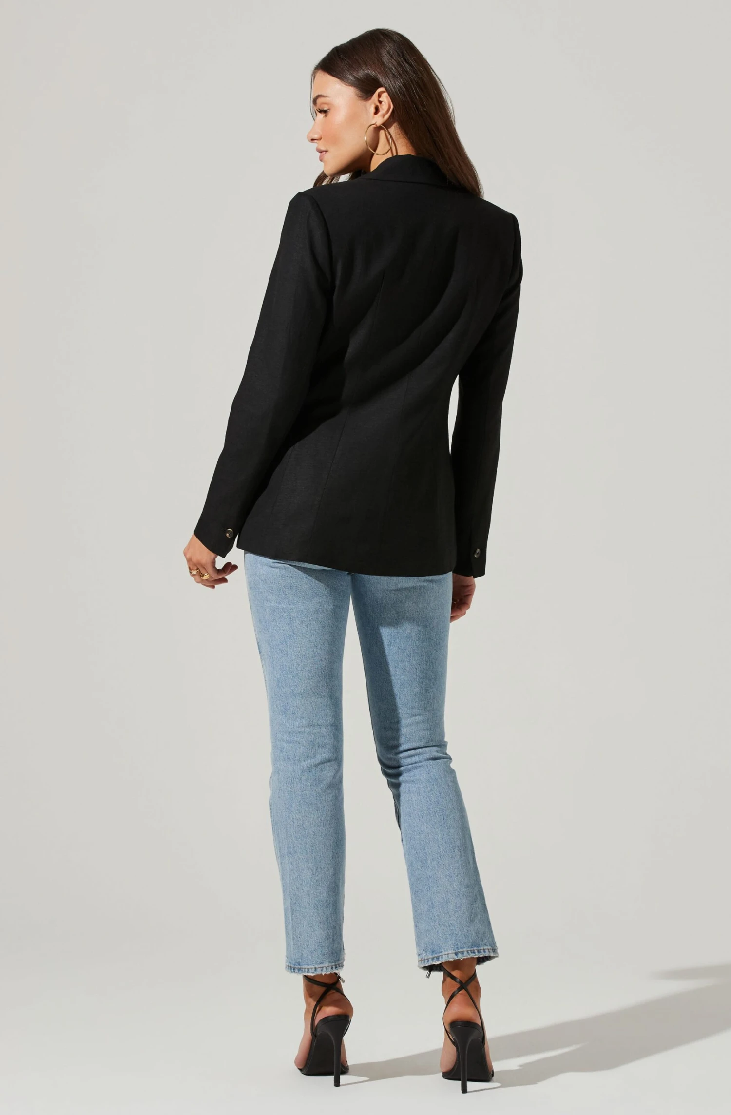 This statement blazer features a fitted silhouette. Notched lapel leads to a buttoned front. Padded shoulders. Long sleeves. Flap pockets.