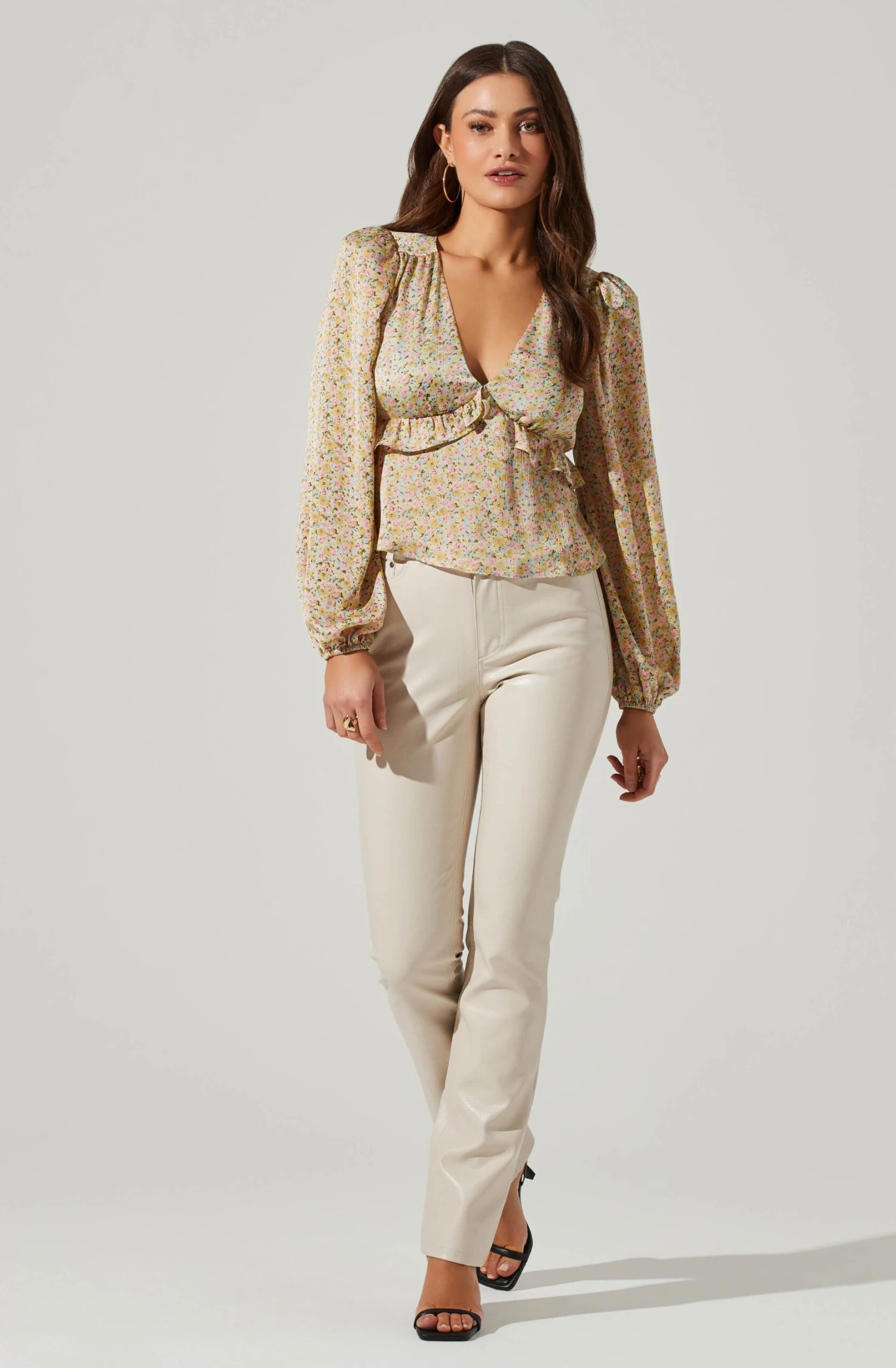 This floral top features a V neckline that leads to a ruffle trim along the bodice. Long sleeves with elastic cuffs. Tie back accents.