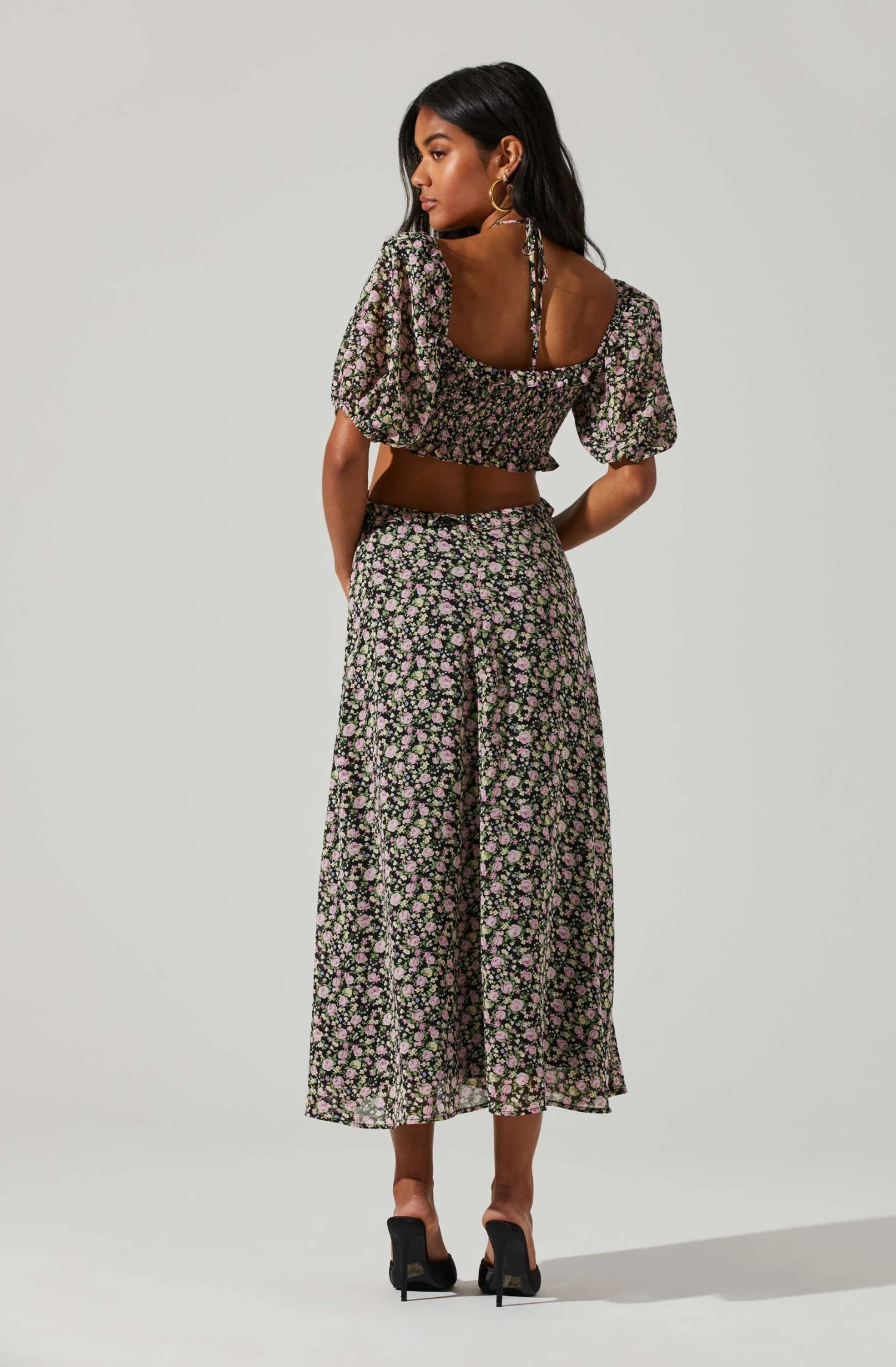 This dreamy dress features a cottagecore floral print style throughout. Halter strap accent supports a notched sweetheart neckline that leads to a ruched bust and cutout waist. Ruffle trim is found throughout this silhouette. Midi-length skirt. Smocked back. Short puff sleeves.
