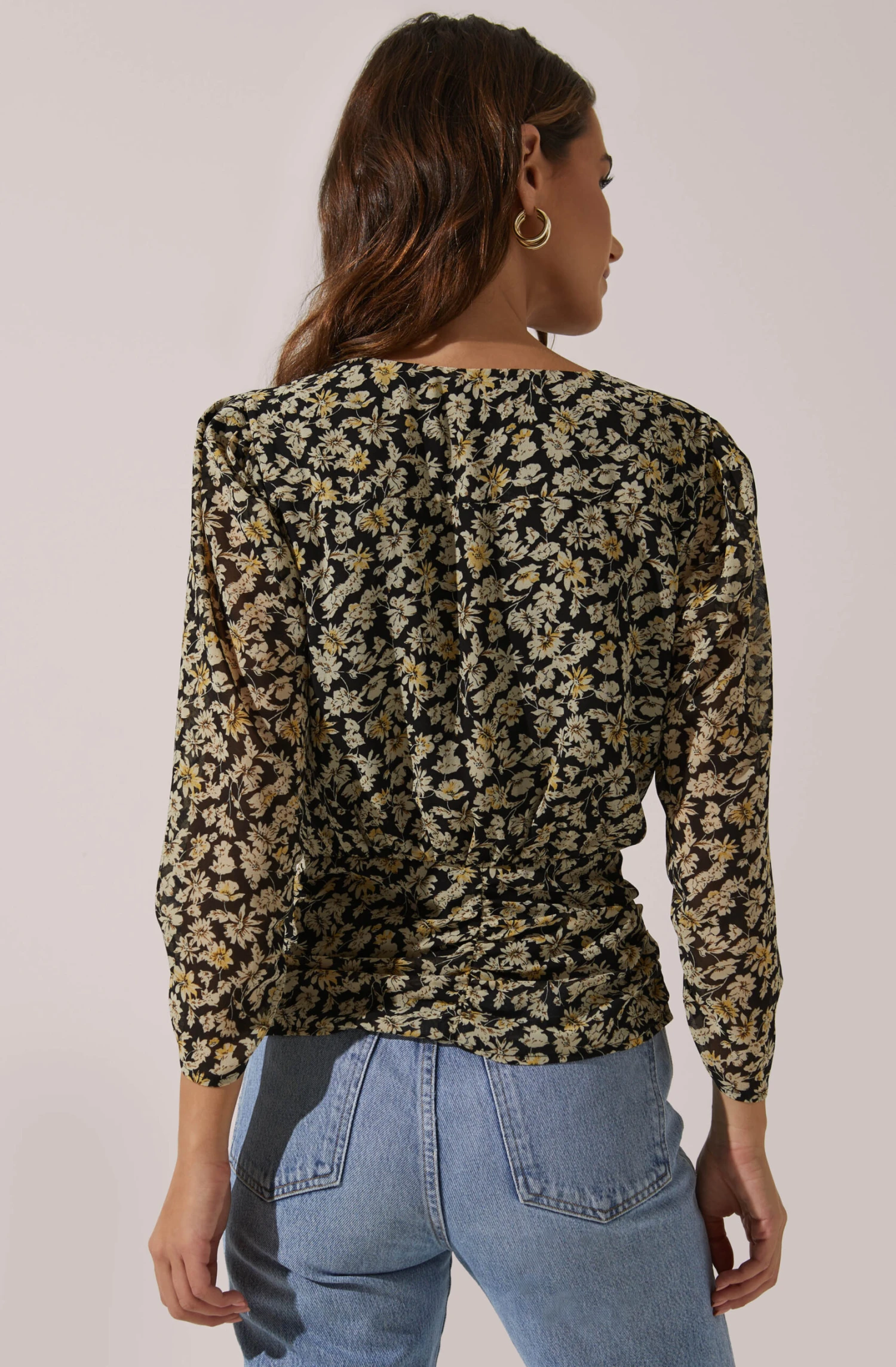 Wrapped in florals. This flattering top features a V neckline that leads to a wrapped front. Long sleeves and cinched waist.