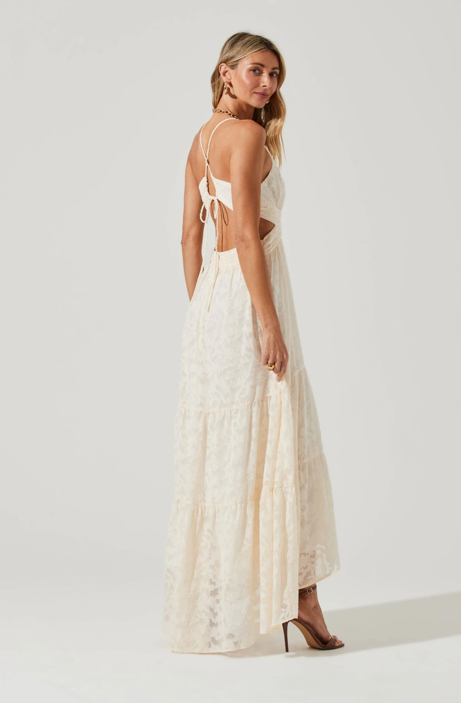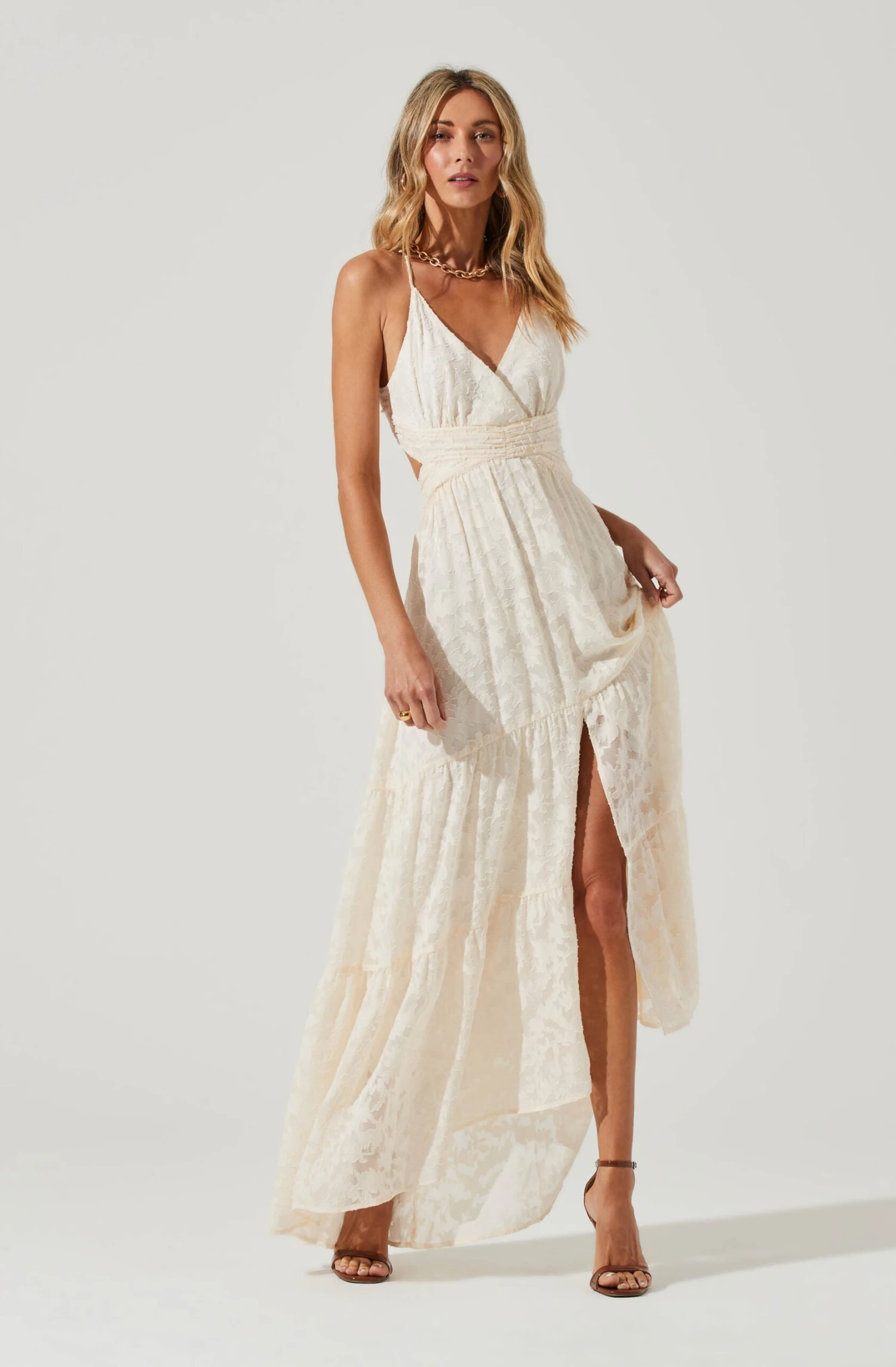The Frolic Dress features a plunge neckline that leads to a defined waist and cutout back. Front slit accent. Tying straps. Burnout floral pattern.