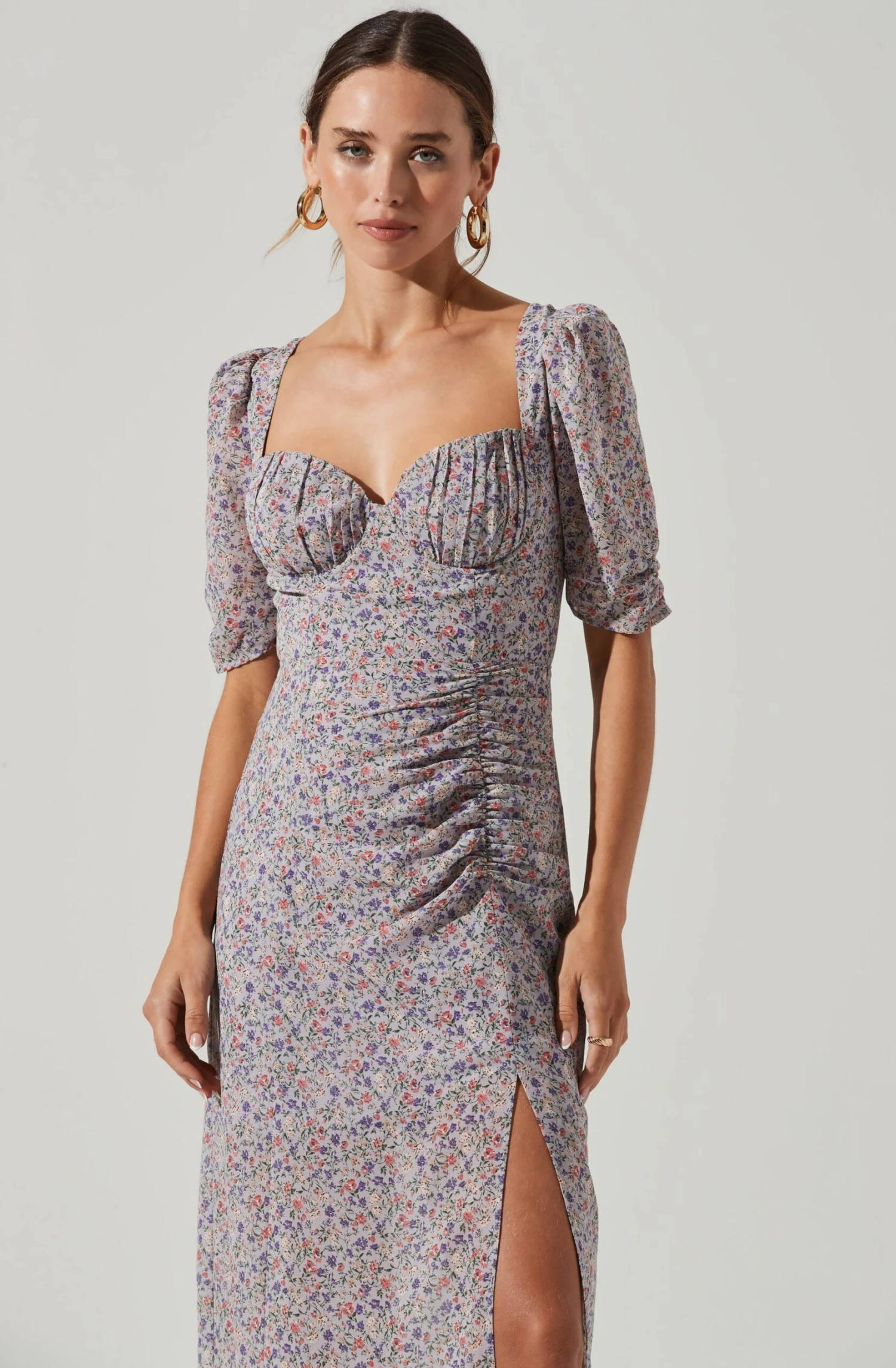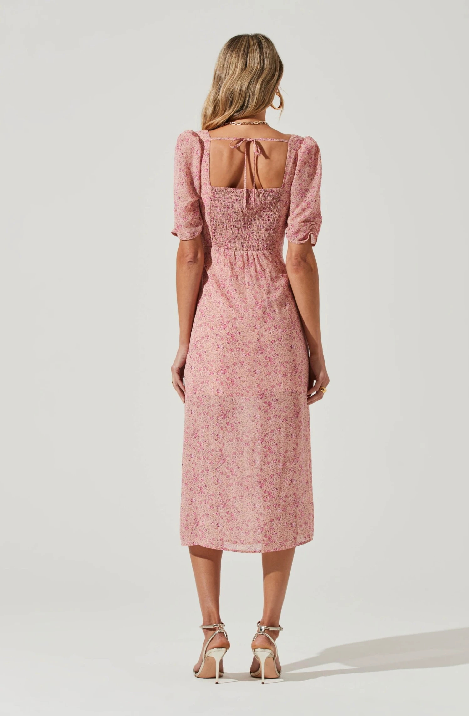 This milkmaid dress features a sweetheart neckline with a flattering bustier design. Ruched bust leads to a midi skirt with ruching details at the side and a sexy front slit accent. Short sheer sleeves. Square cut back with tying straps.