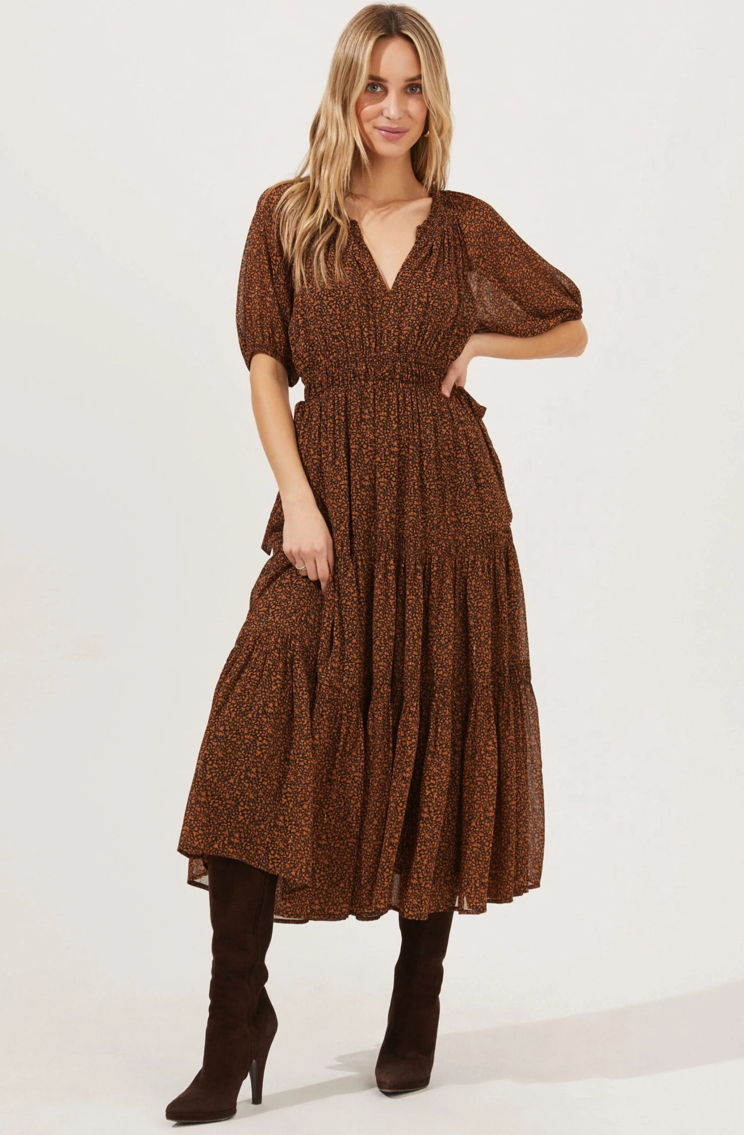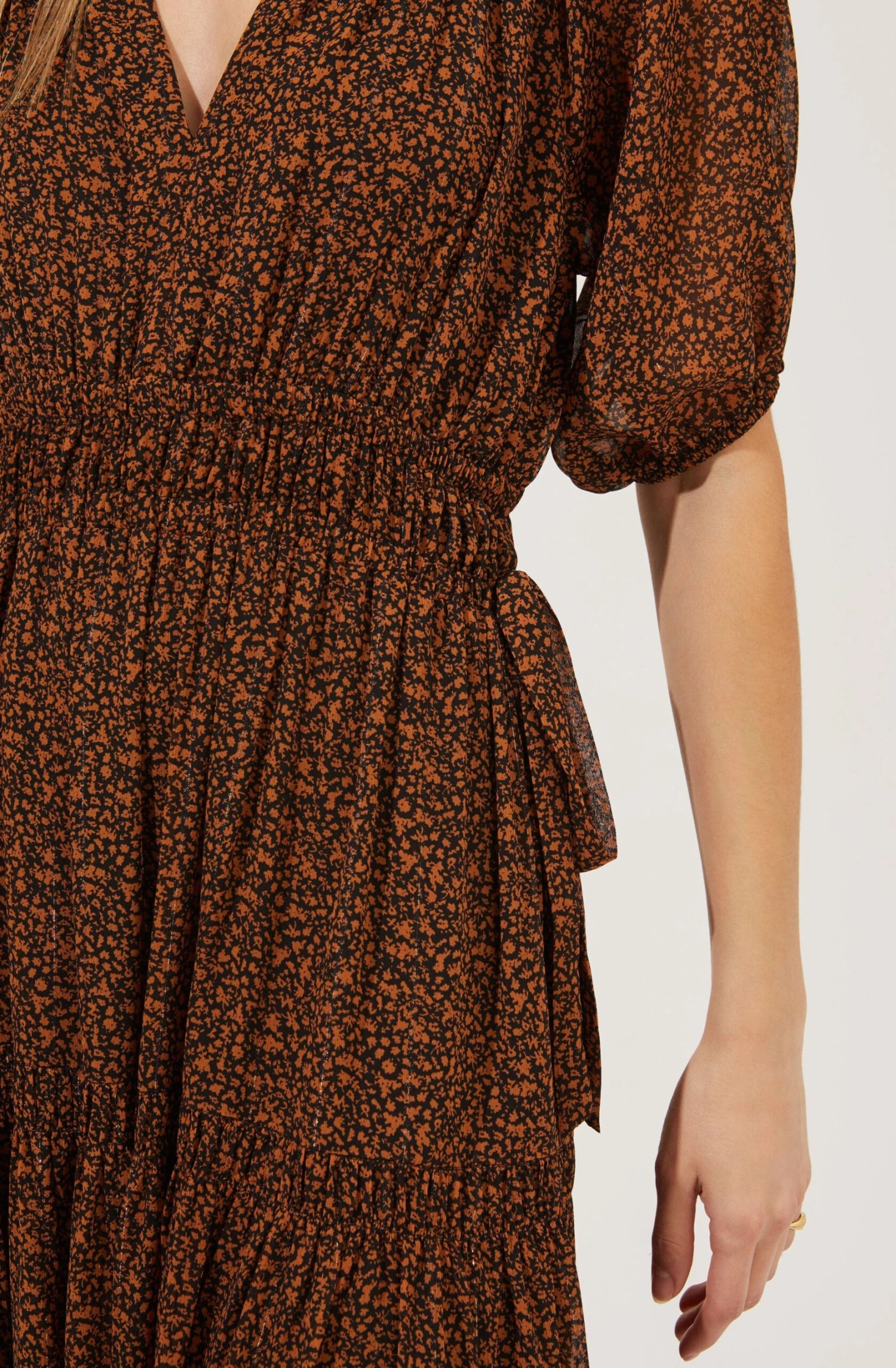 In a garden state of mind. This romantic dress features gold threads woven throughout a floral print fabric. V neckline descends to a smocked waist. Short sheer sleeves. Midi-length skirt features a tiered design. Fully lined.