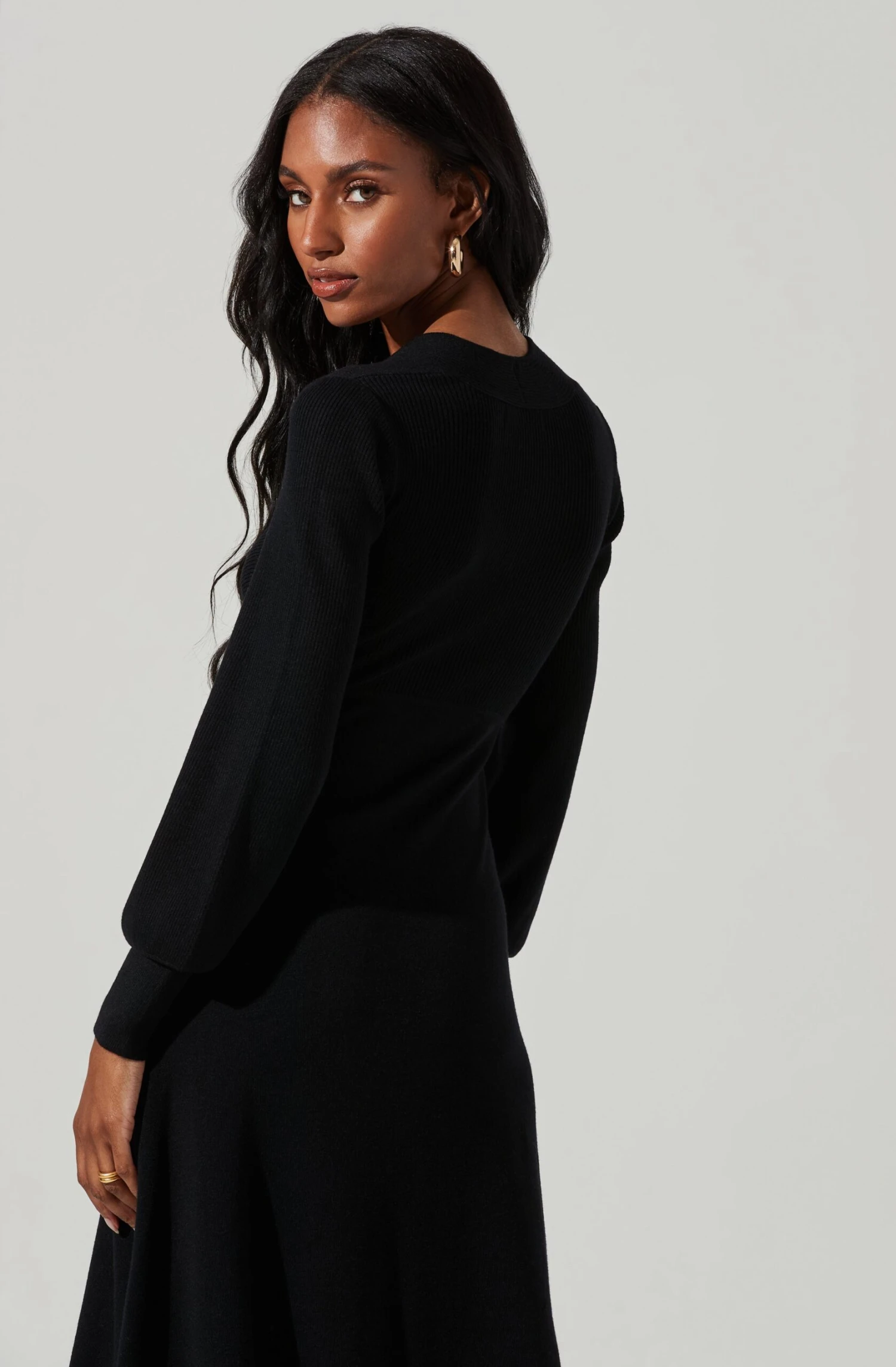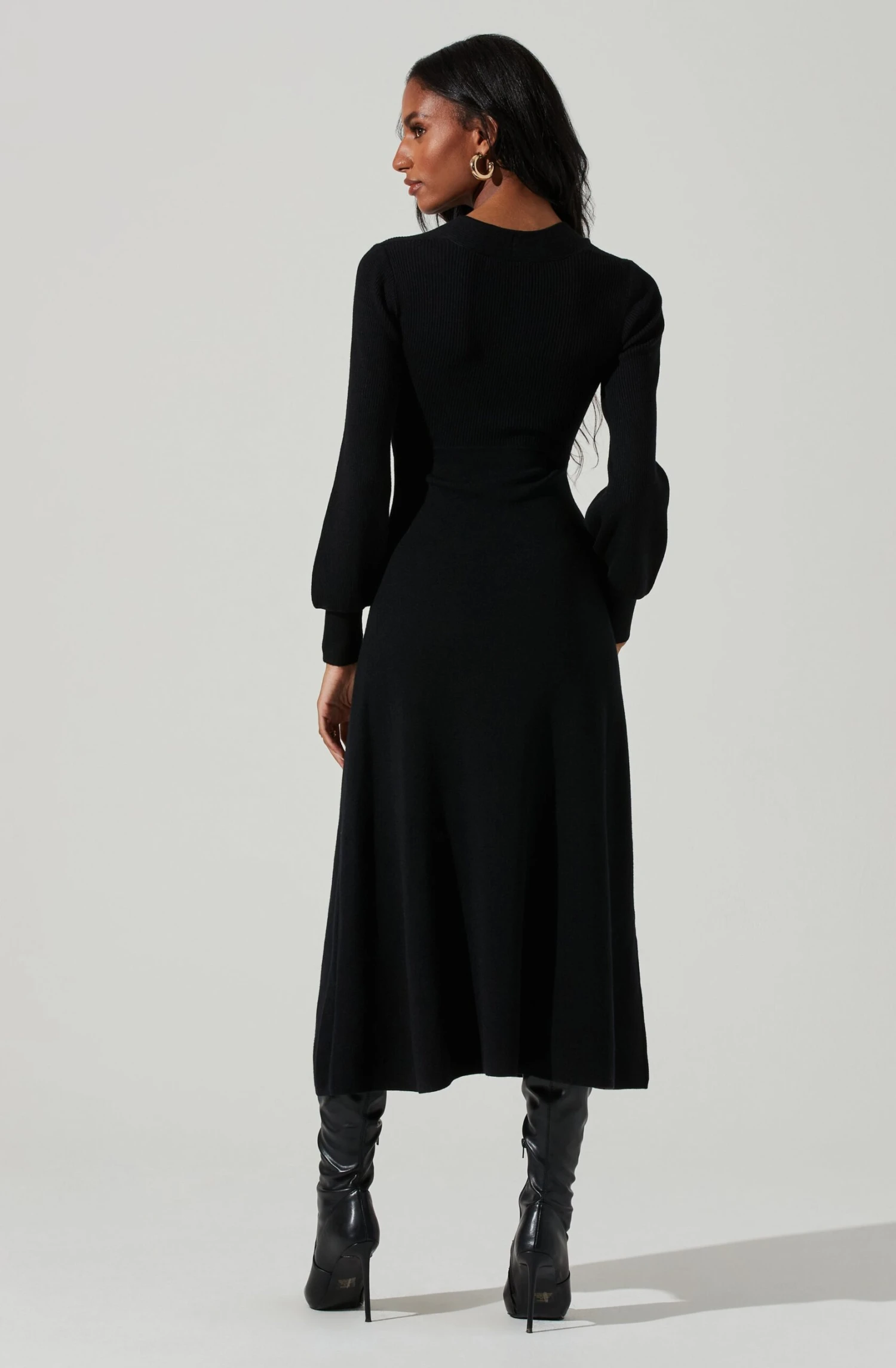The Genevieve Dress features a ribbed knit construction. Sweetheart neckline leads to a bodycon silhouette and midi-length skirt. Long mutton sleeves.