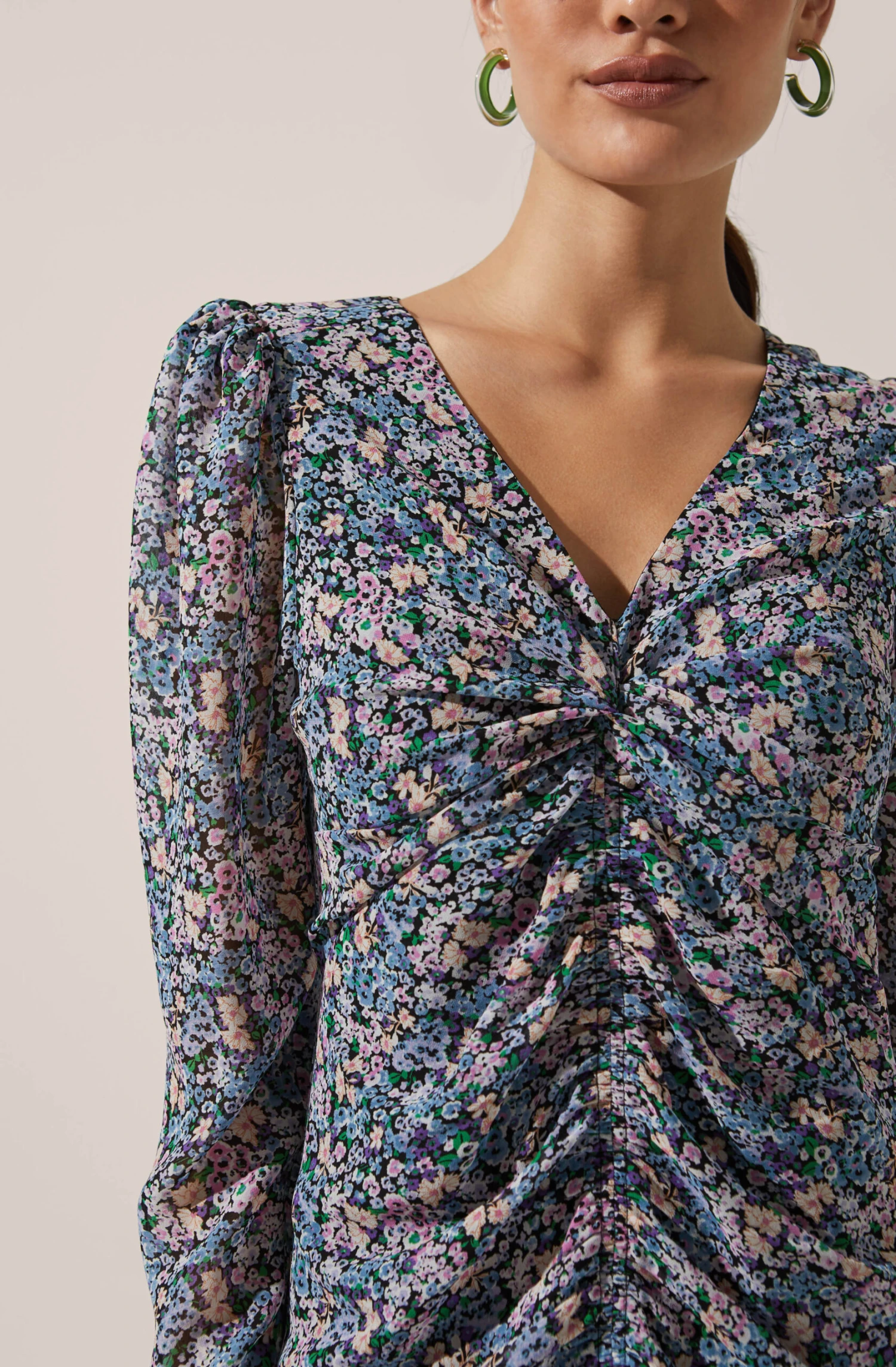 Ready, set, romance. This midi dress features a statement floral print throughout with a V neckline that leads to a ruched front and hi-lo hemline. Long sleeves.
