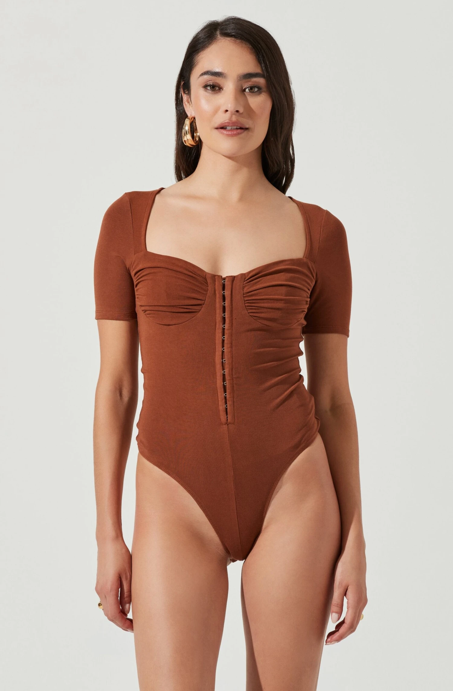 This flattering bodysuit features a sweetheart neckline that leads to a hook-and-eye corset bodice. Shirred bust. Short sleeves. Attached thong bottoms have snap button closures.