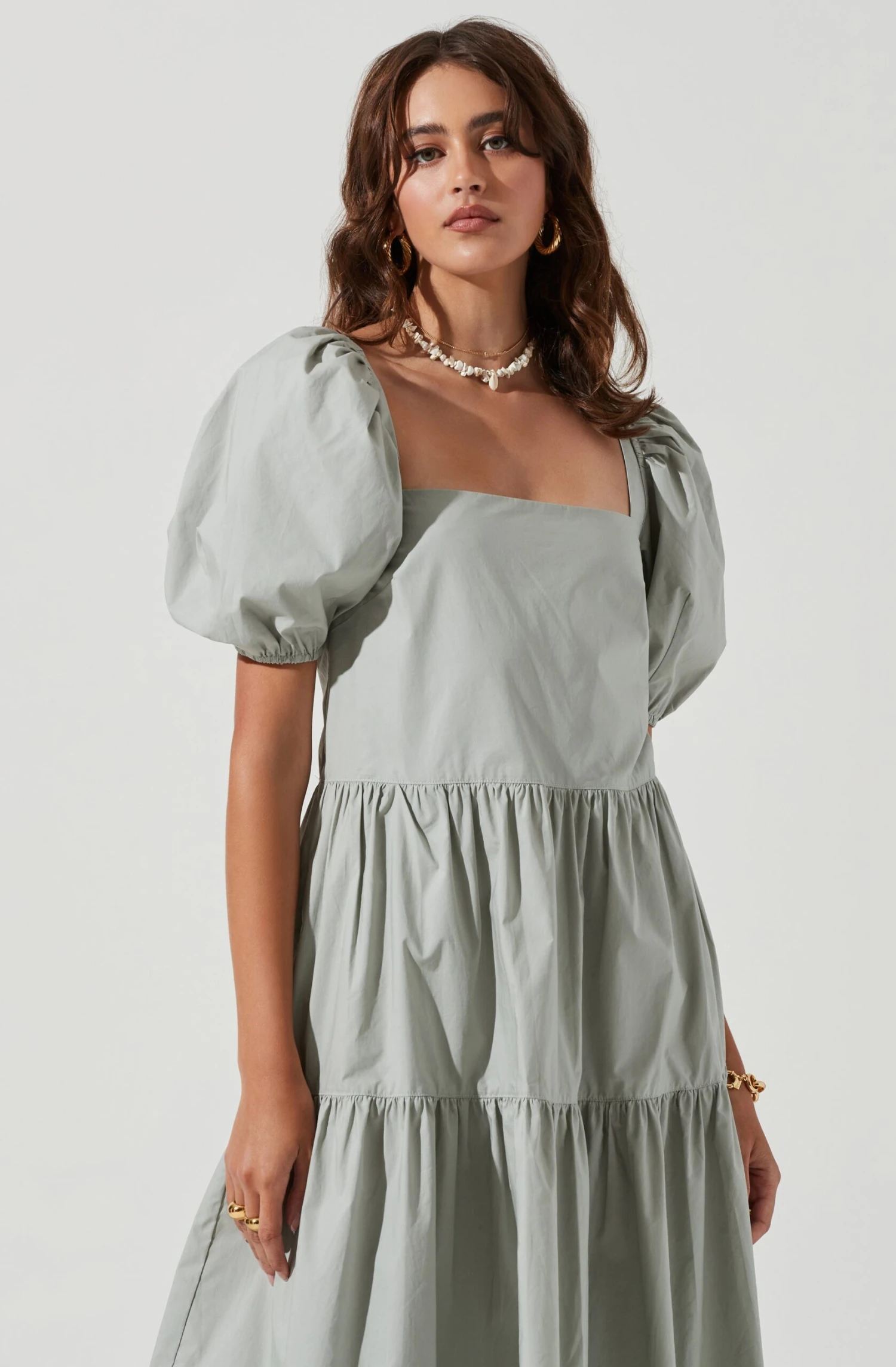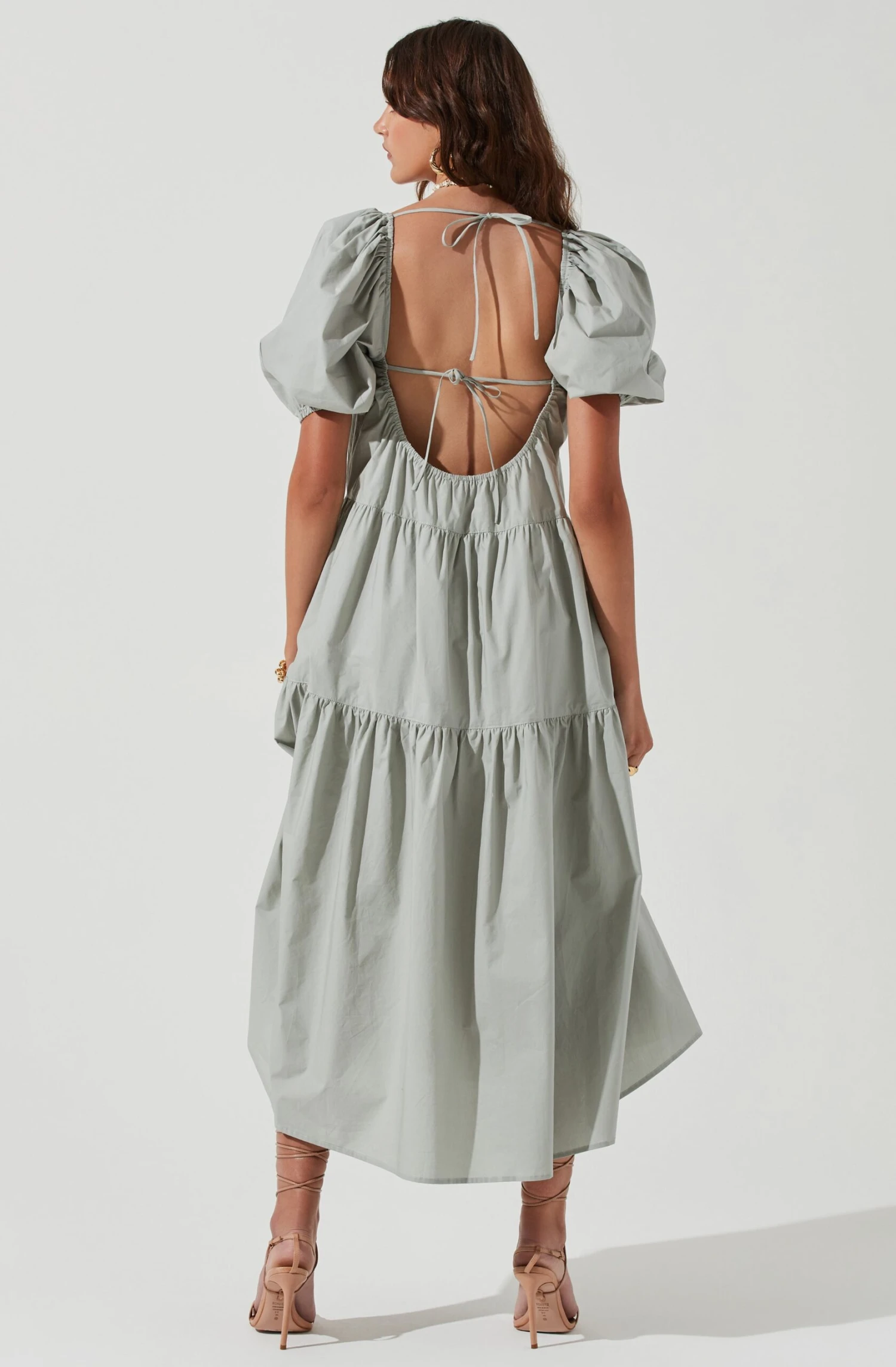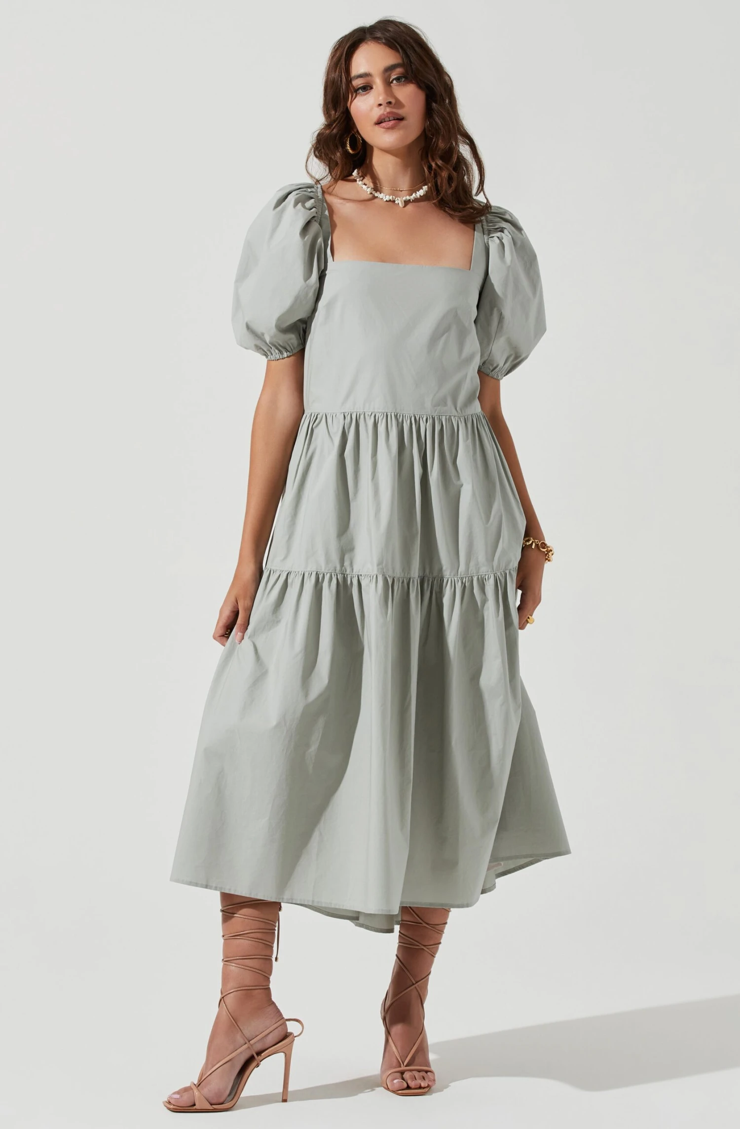 This romantic midi dress features a square neckline that leads to a tiered bodice and midi skirt with side pockets. Open back with dual tying straps. Short puff sleeves. Fully lined.