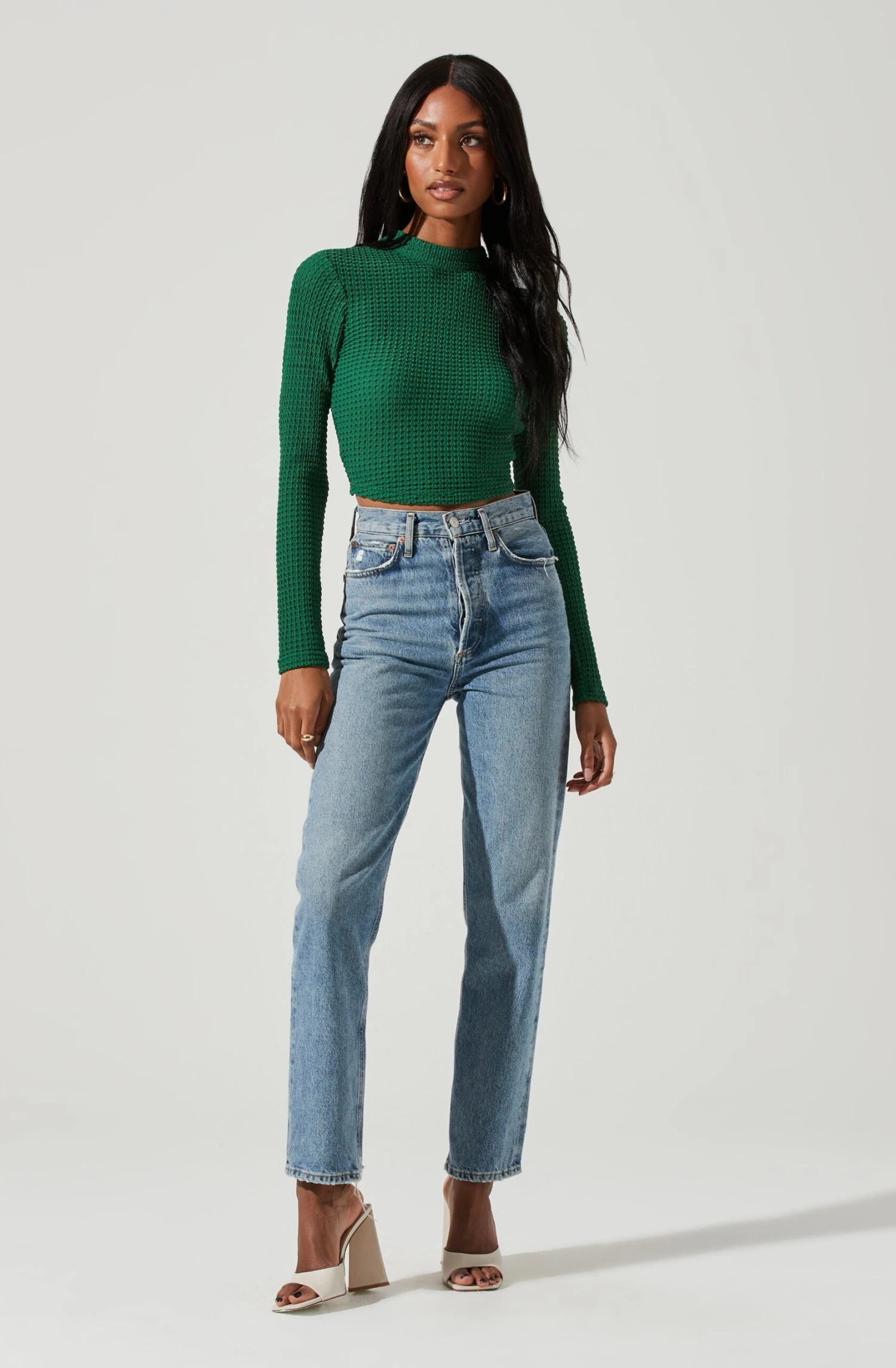 Make an outfit statement in the Kae Top. This waffle-knit style features a high neckline that leads to a fitted design with an open back and lower tie string accents. Long sleeves.