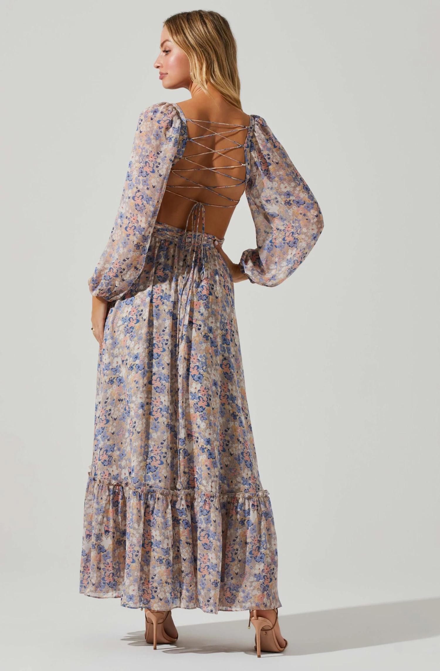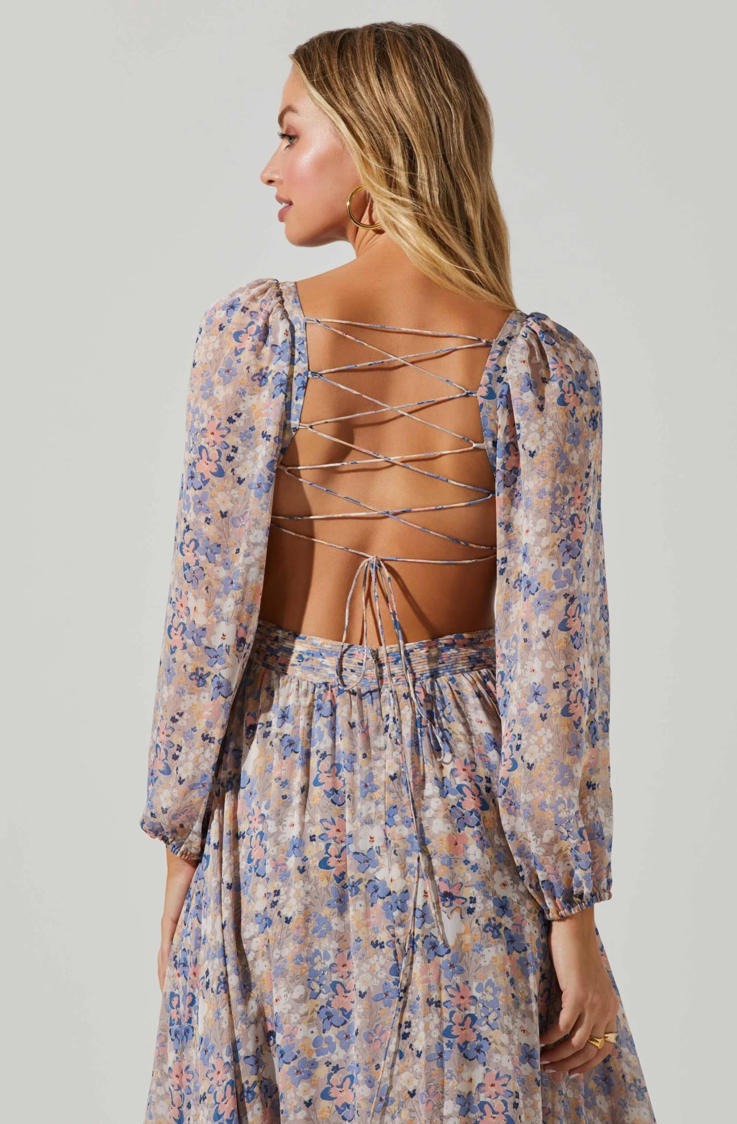 The Kammy Dress features a romantic floral print. V neckline leads to a pleated bodice and side cutout accents. Flowy maxi skirt features a ruffle hem. Open back showcases a cross strap back that ties at the bottom. Long sleeves. Concealed back zip closure.