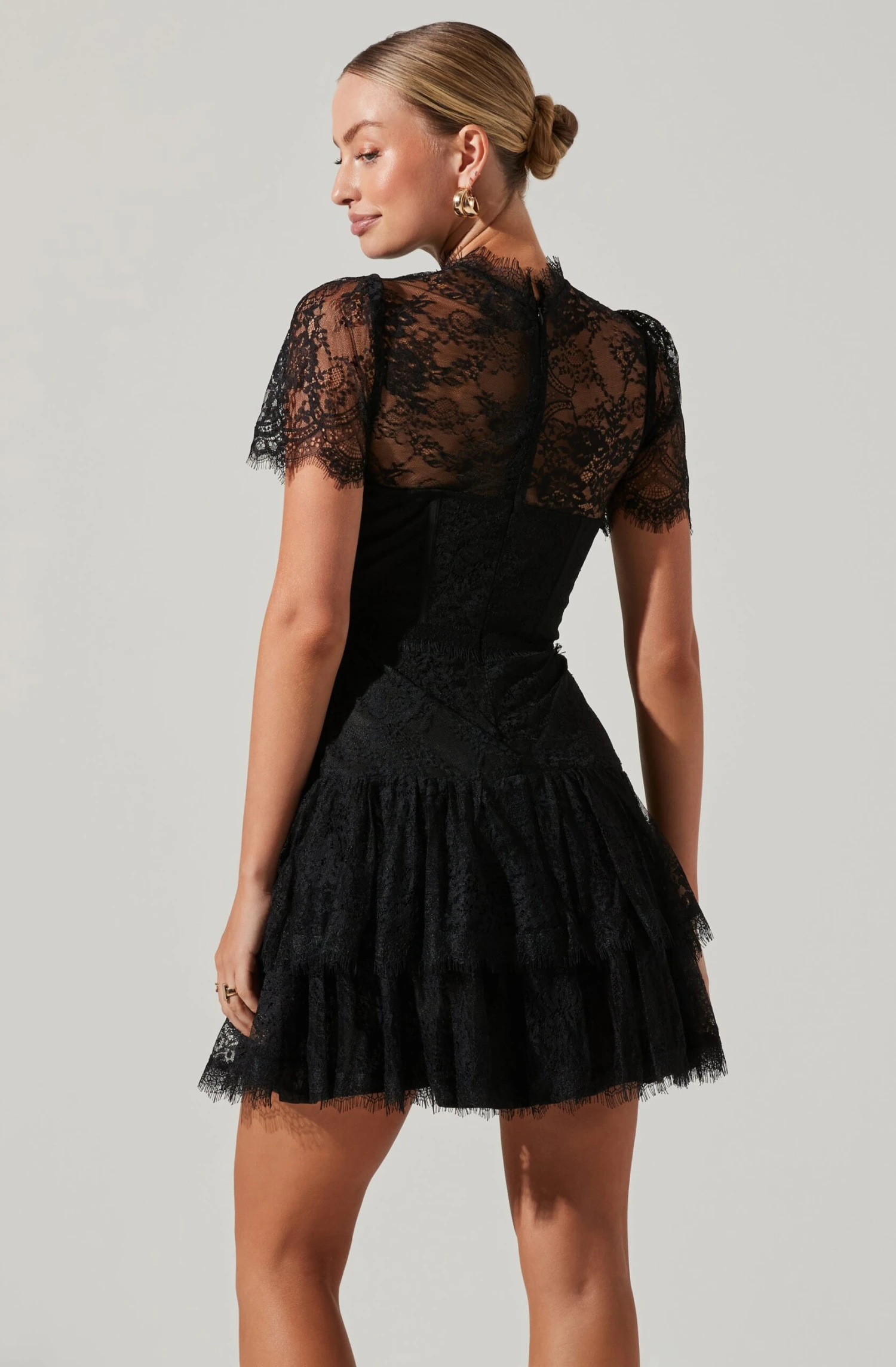 The Leilani Dress is a lace dream come true. It has a sheer lace overlay that features a scalloped collar and short sleeves. Bustier front frames your figure and adds a touch of sexy. Mini skirt features a tiered ruffle design in lace. Back zip closure.