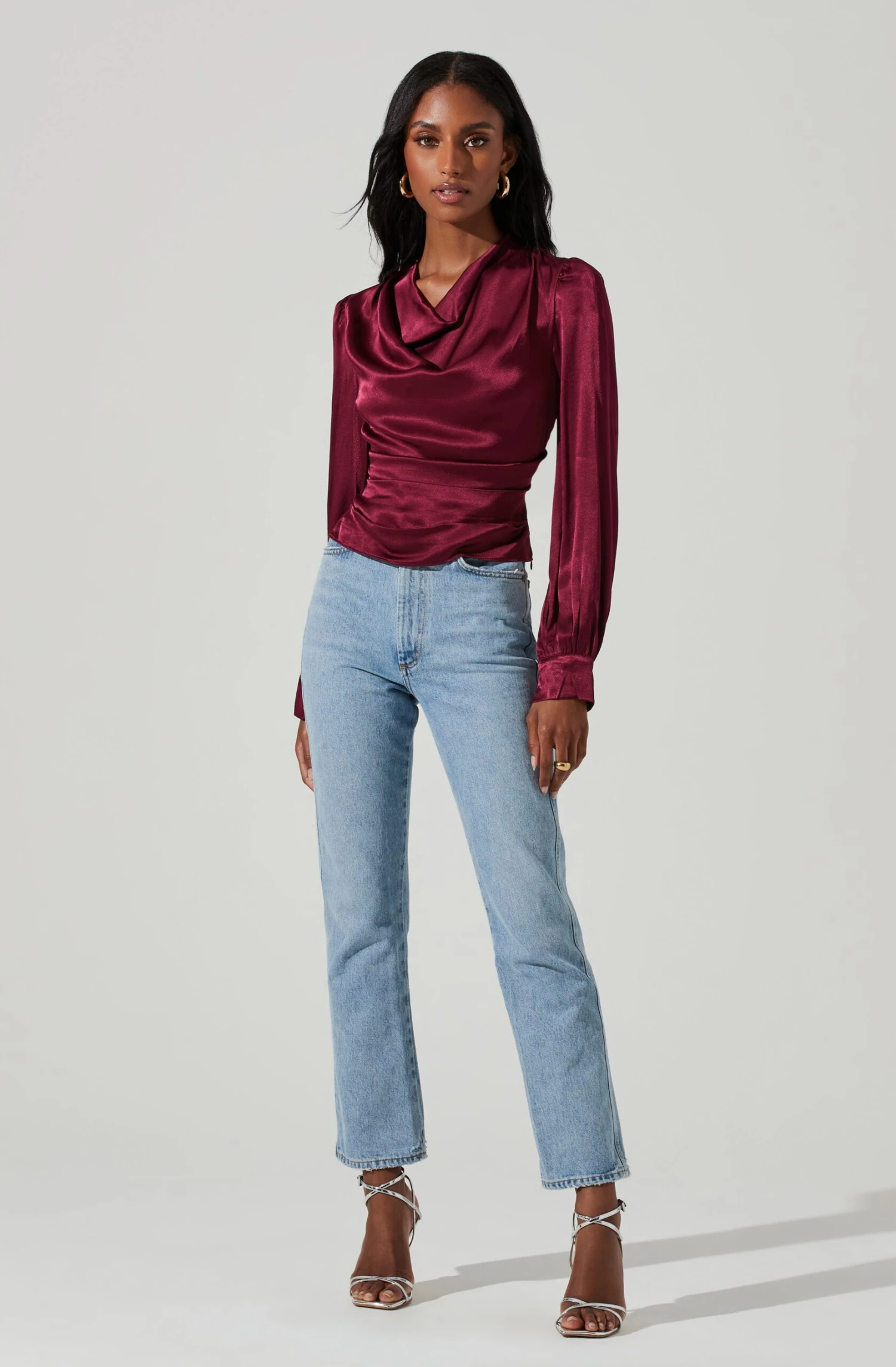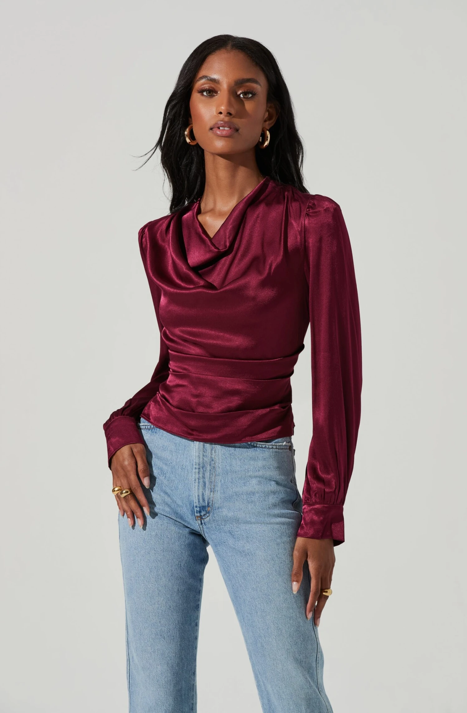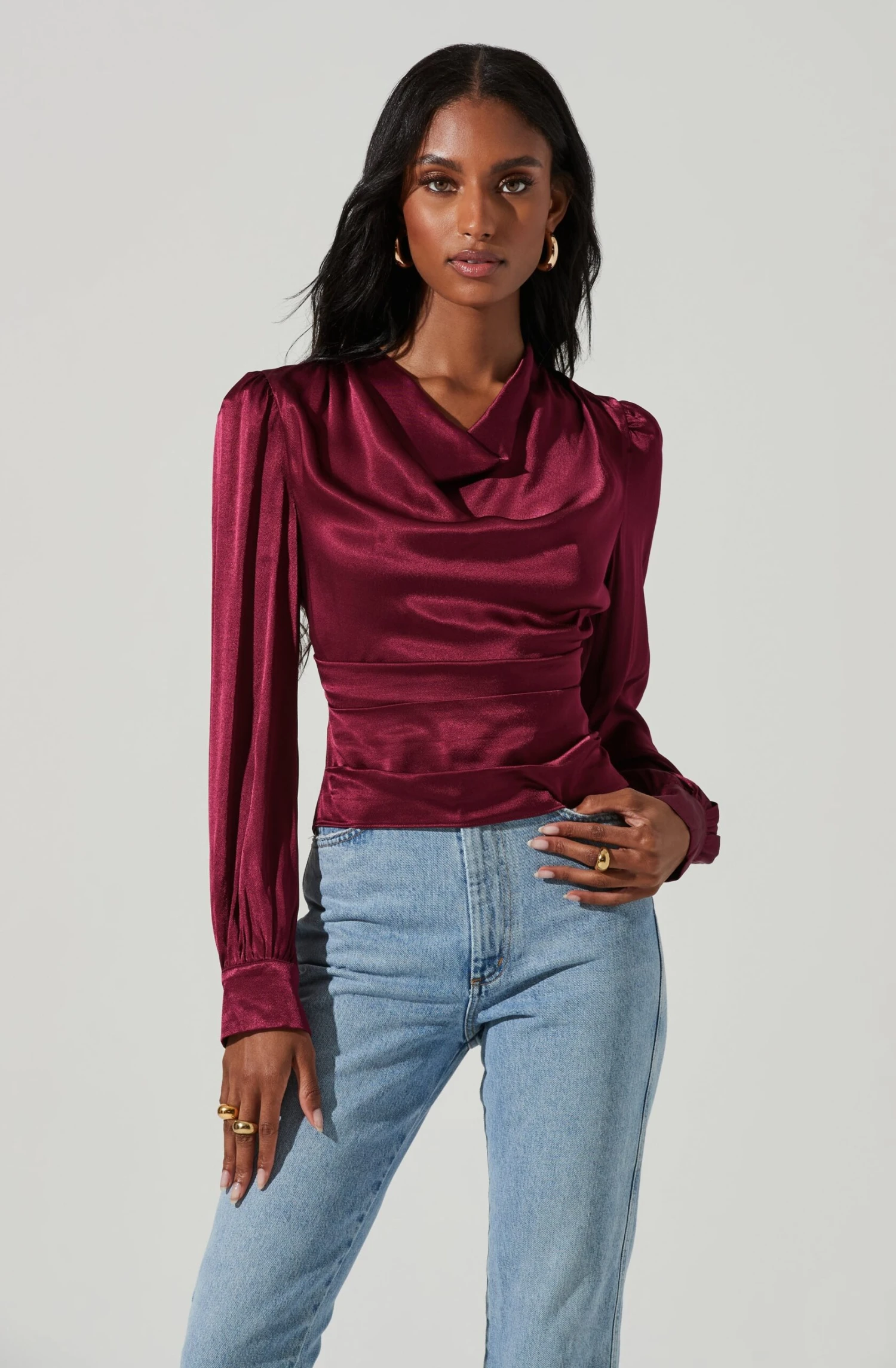 The Lilith Top features a high-shine satin construction. Cowl neckline leads to a fitted silhouette. Padded shoulders. Long sleeves. Keyhole back.
