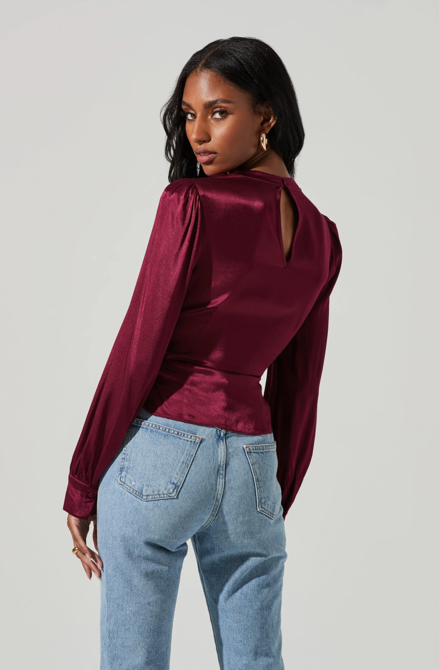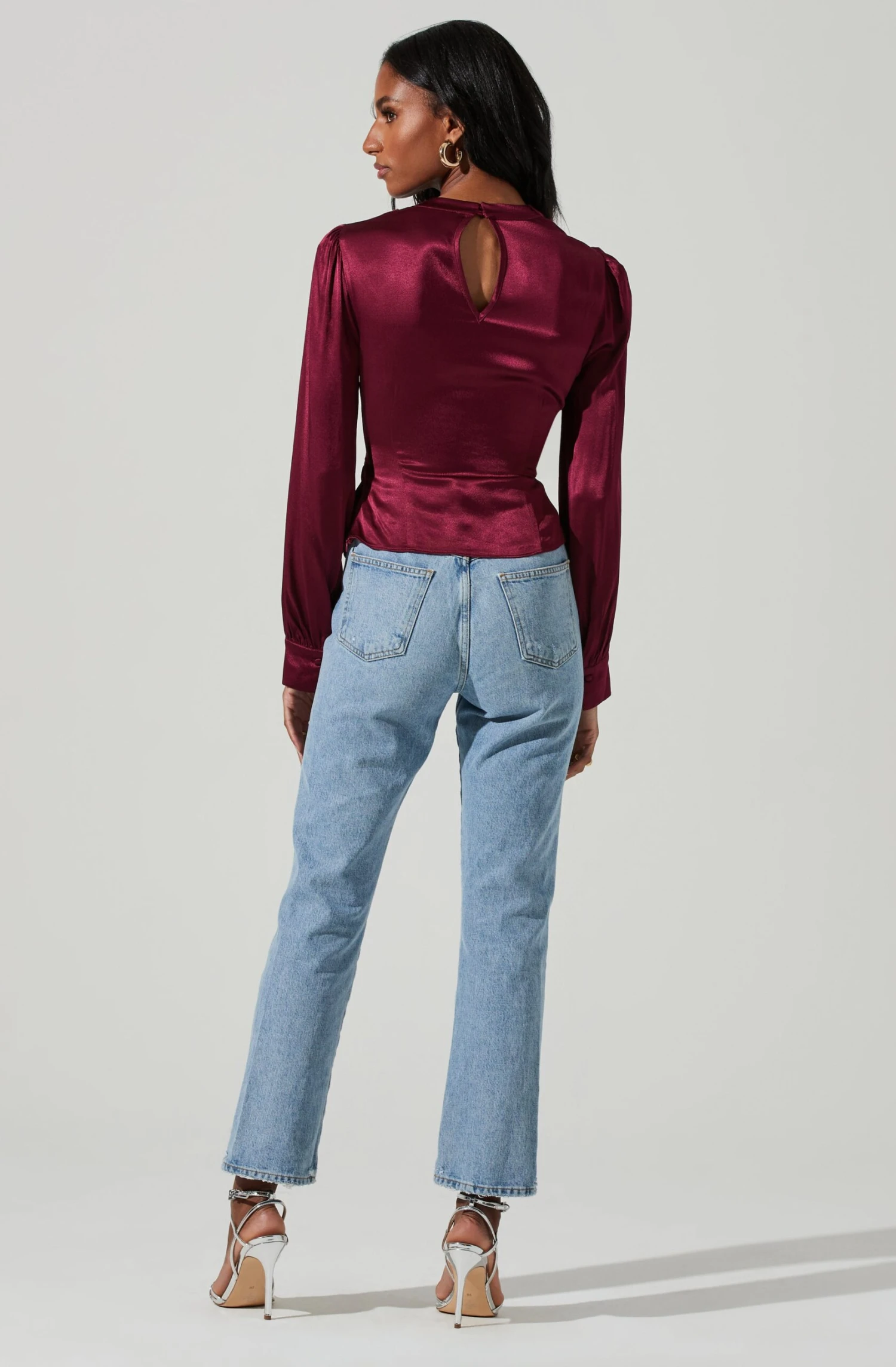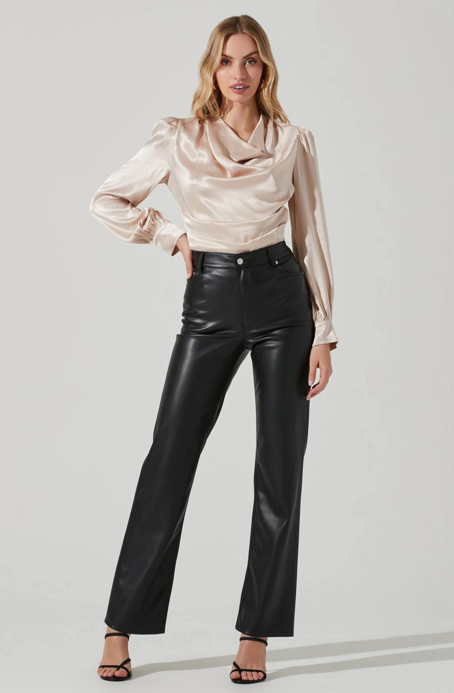 The Lilith Top features a high-shine satin construction. Cowl neckline leads to a fitted silhouette. Padded shoulders. Long sleeves. Keyhole back.