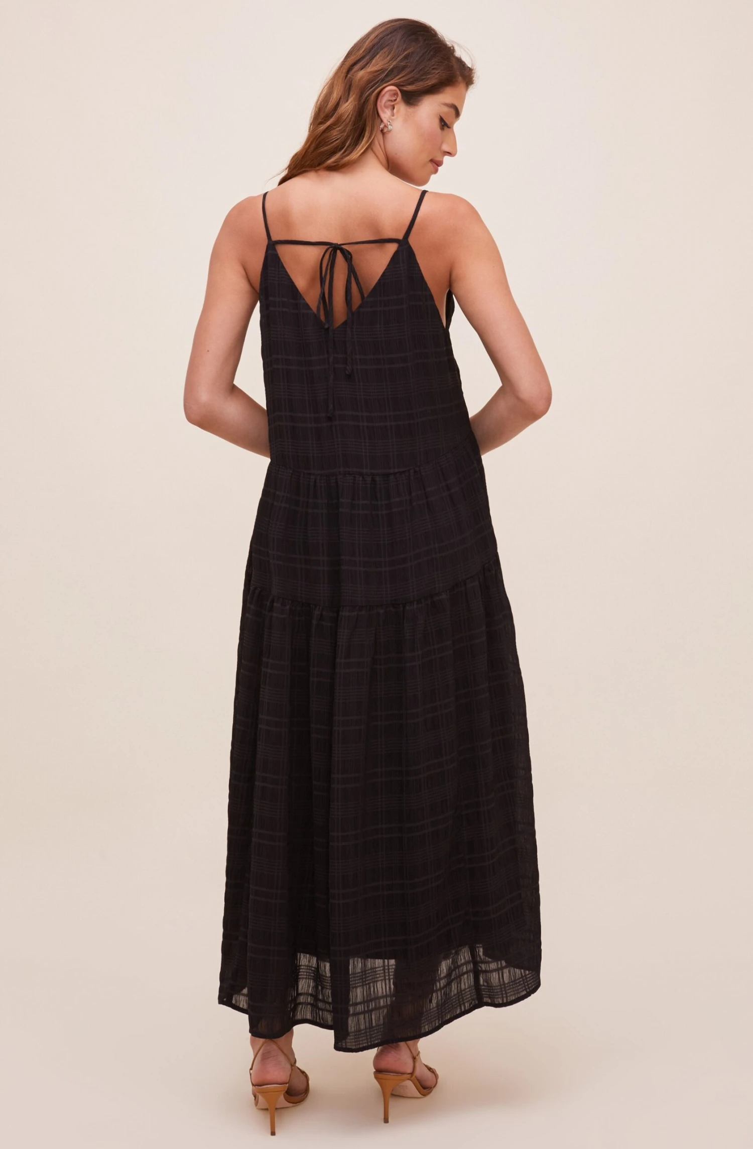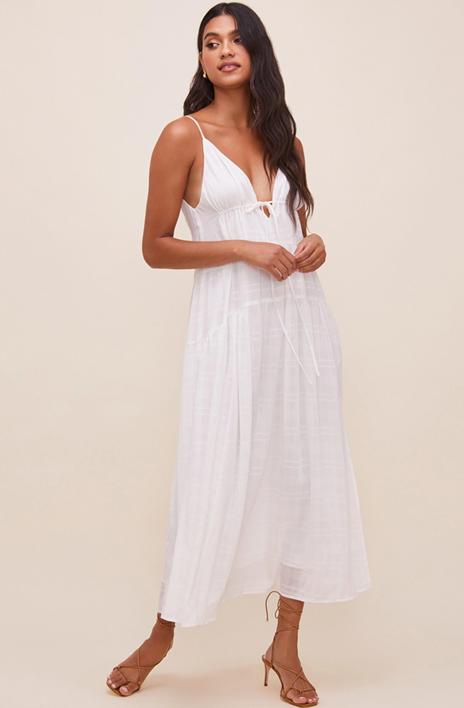 Sway with me. The Lizbeth Dress features a sexy plunge neckline that meets an empire waist with a drawstring accent. Flowy maxi skirt features a front slit accent. Adjustable spaghetti straps with tie at the back. Fully lined.