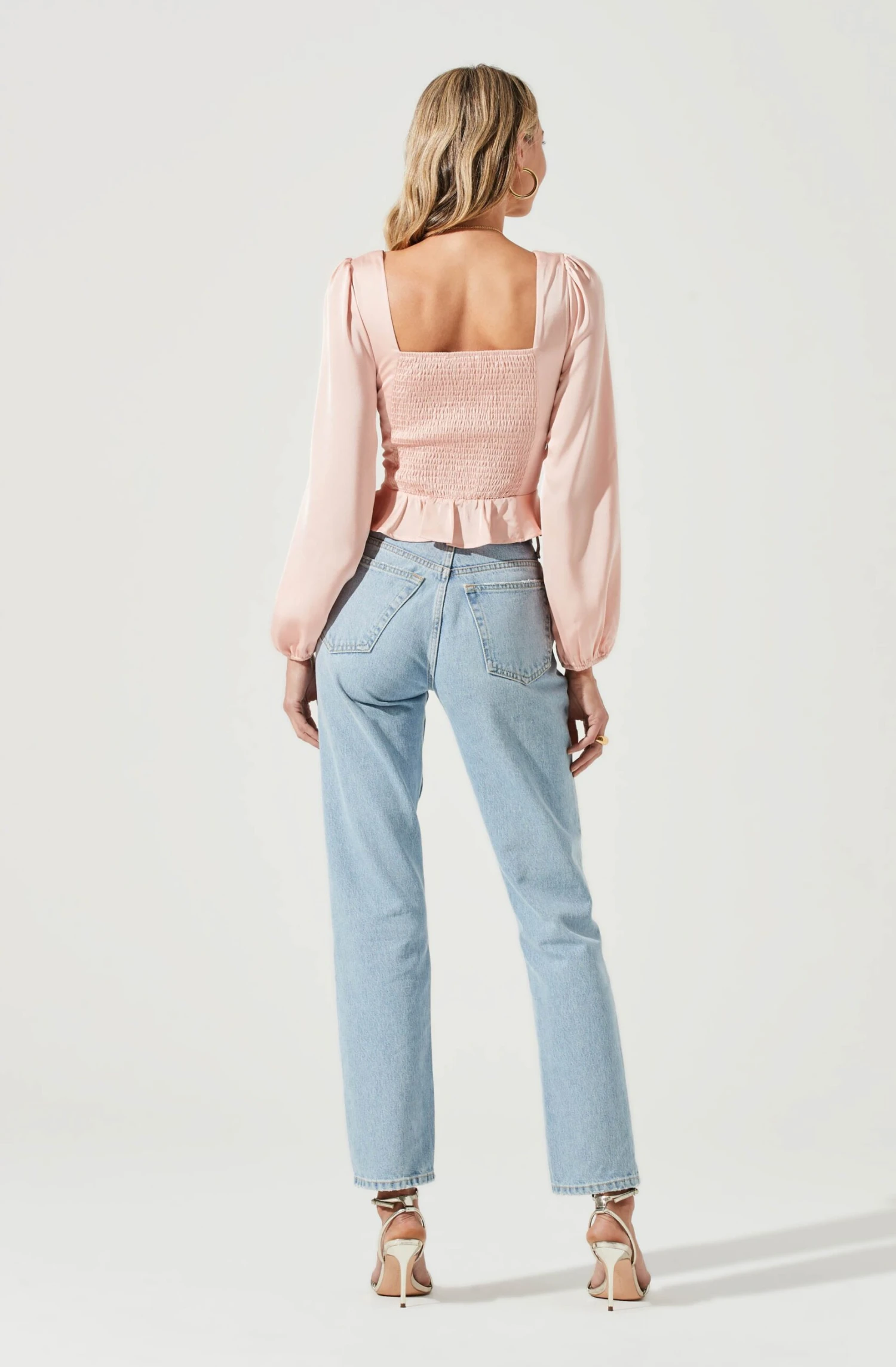 This satin top features a sweetheart neckline that leads to a hook-and-eye front and finishes with a peplum hem. Long puff sleeves. Smocked back. Darted bust.