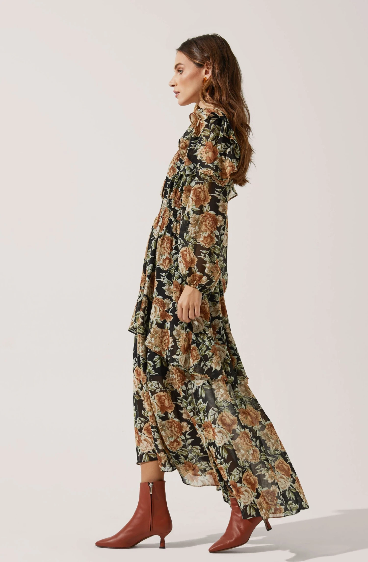 A secret garden of florals. This maxi dress features a V neckline that leads to a smocked waist and ruffle maxi skirt. Long puff sleeves with ruffle trim.