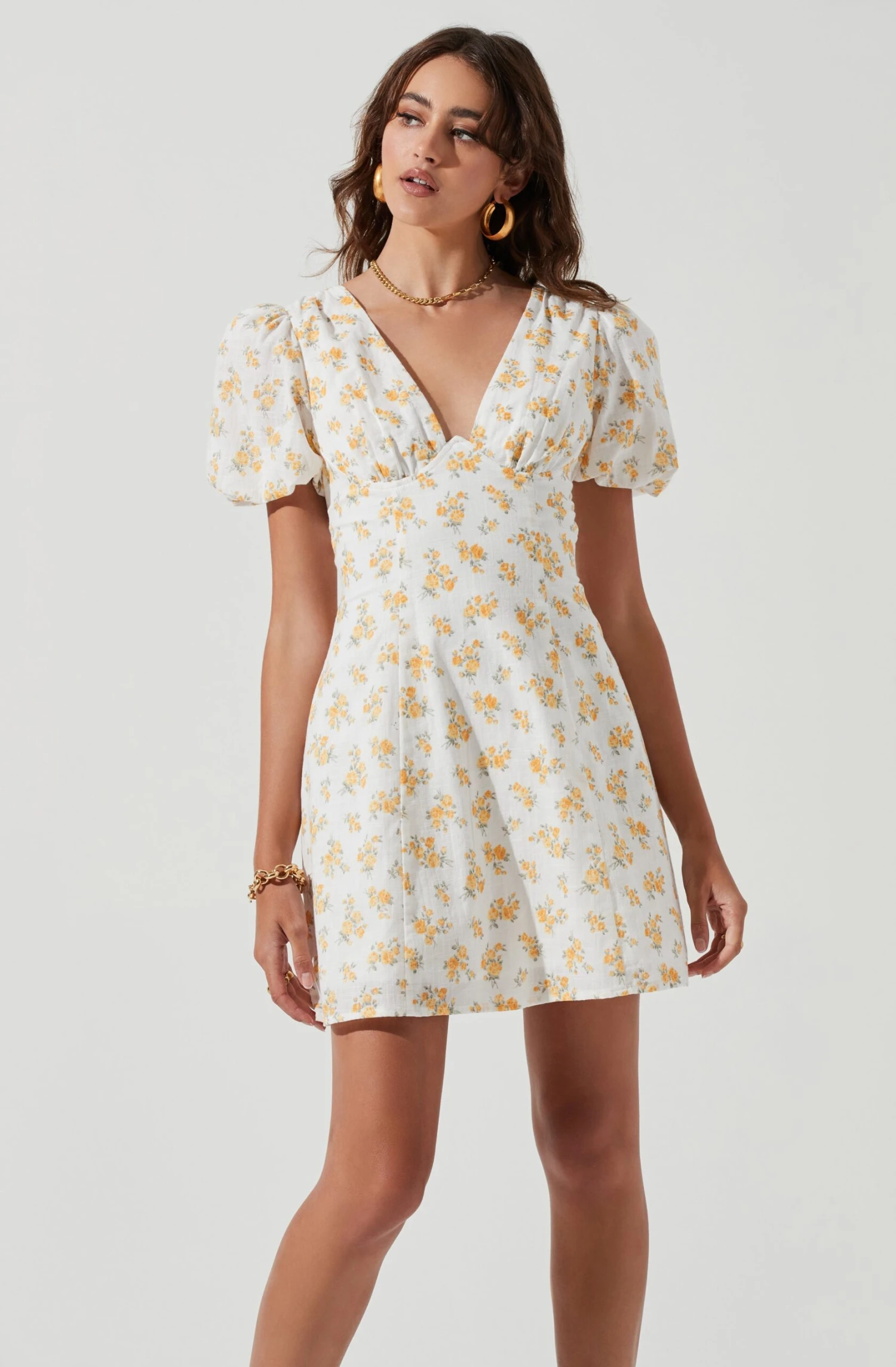 The Lovegrove Dress is ready for romance. This mini silhouette features a V neckline that leads to a gathered bust and defined waist. A-line skirt. Short puff sleeves. Open back with tying straps. Fully lined. Concealed back zip closure.