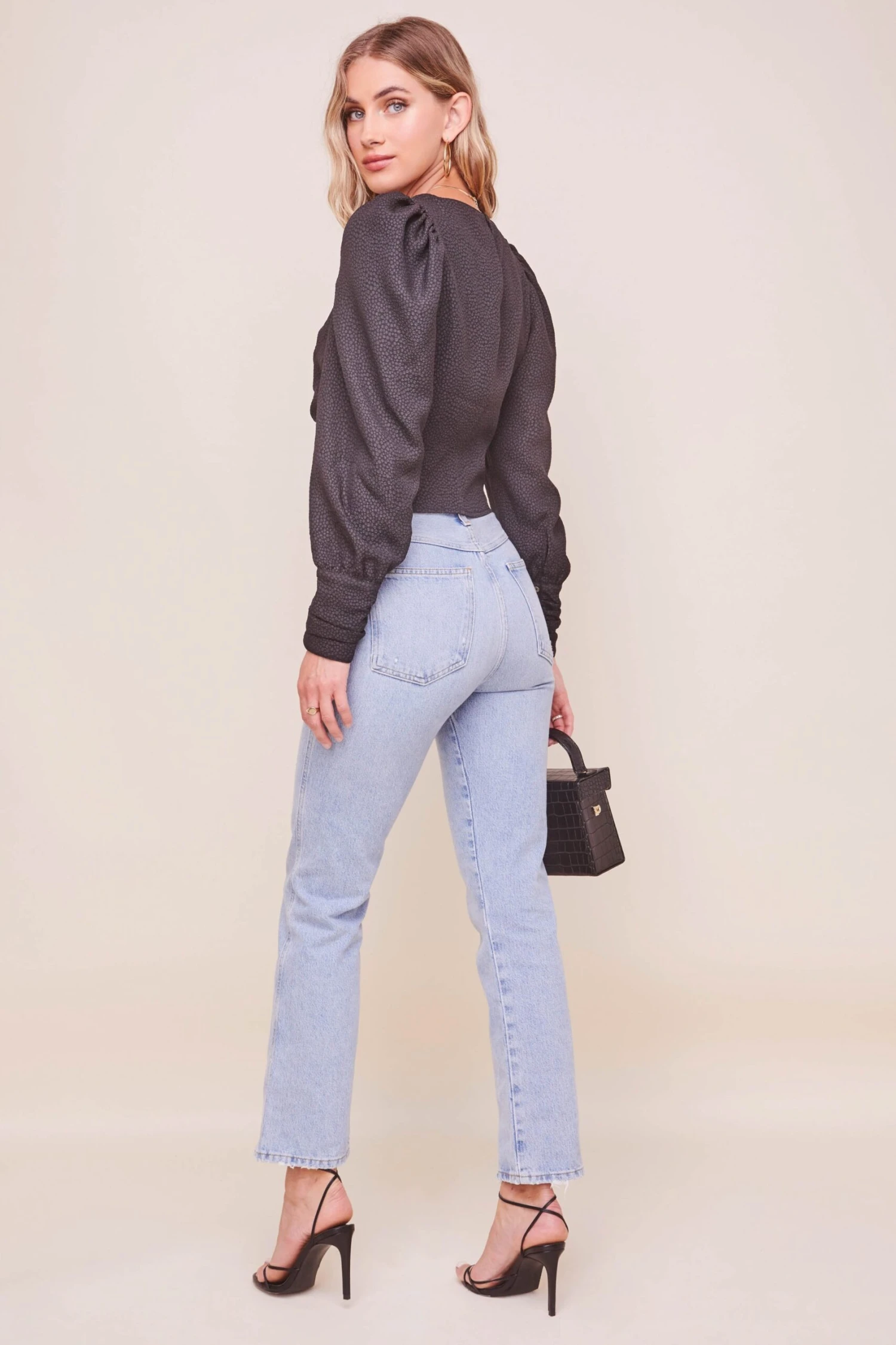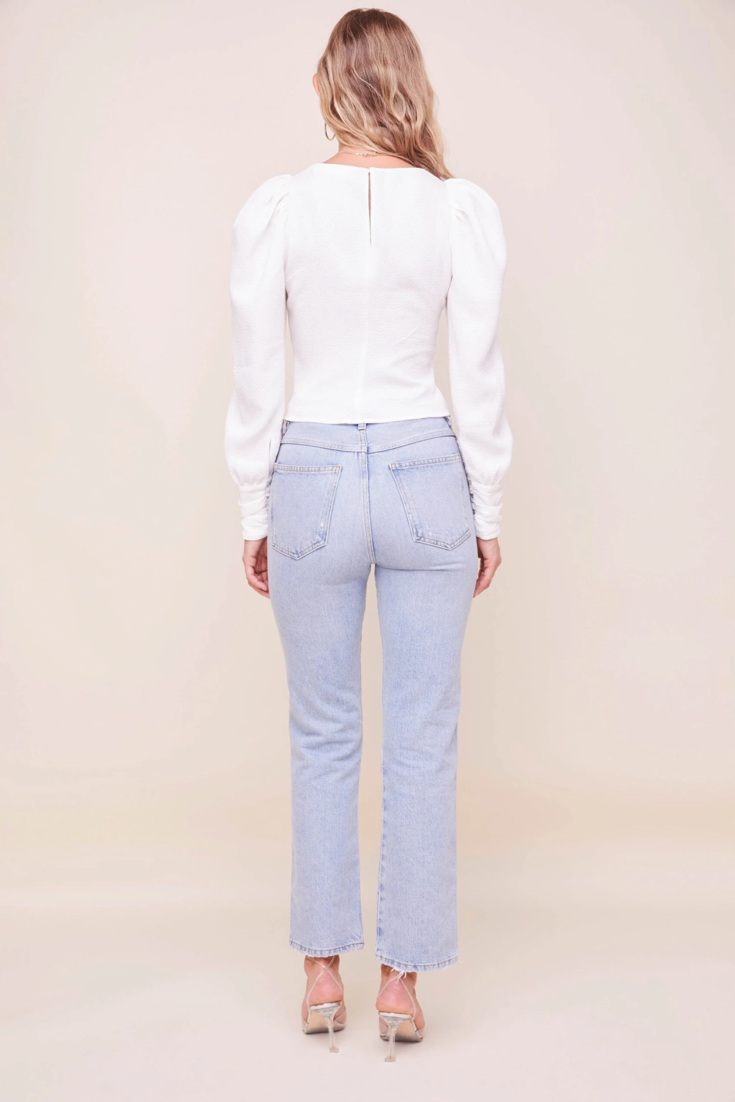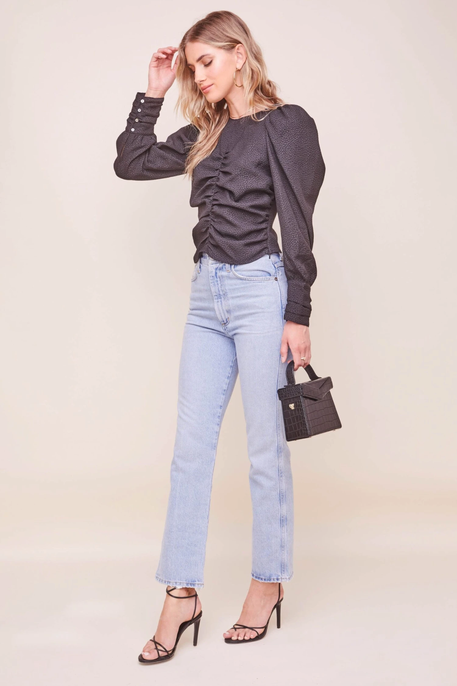 The Magdalene Top elevates casual outfits this holiday season. With a ruched front, this style is further accentuated with long puff sleeves and keyhole back.