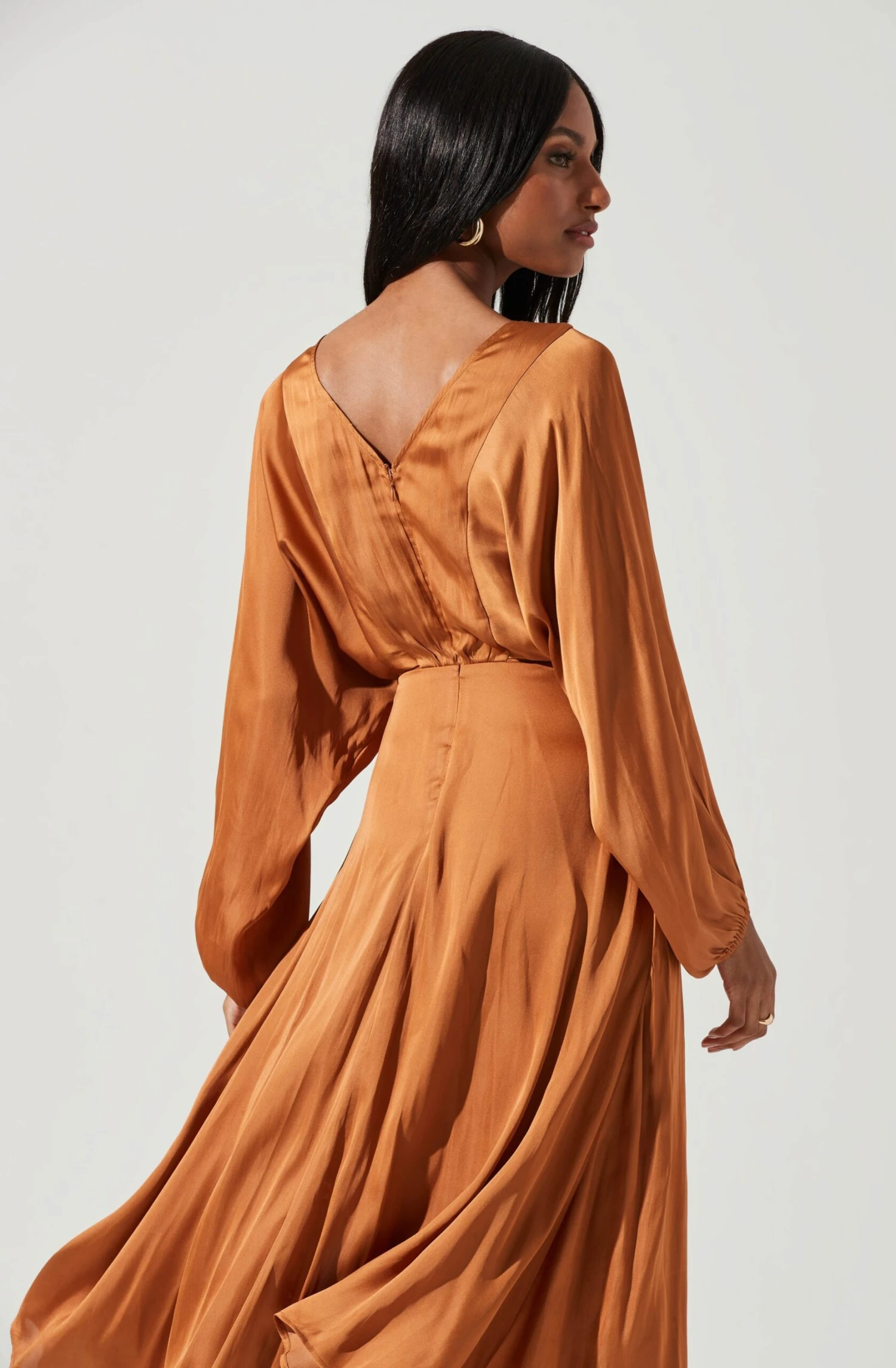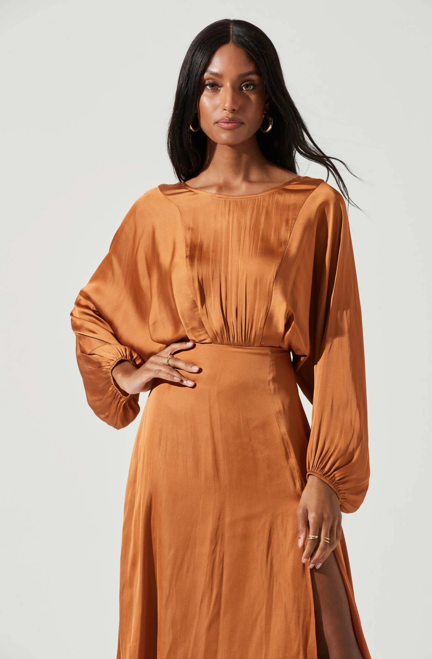 Love stories start here. This gorgeous satin-finish dress features a draped silhouette with long dolman sleeves, gathered front and cinched waist. Front slit accent punctuates a flowy and lined midi skirt. V-cut back. Concealed back zip closure.