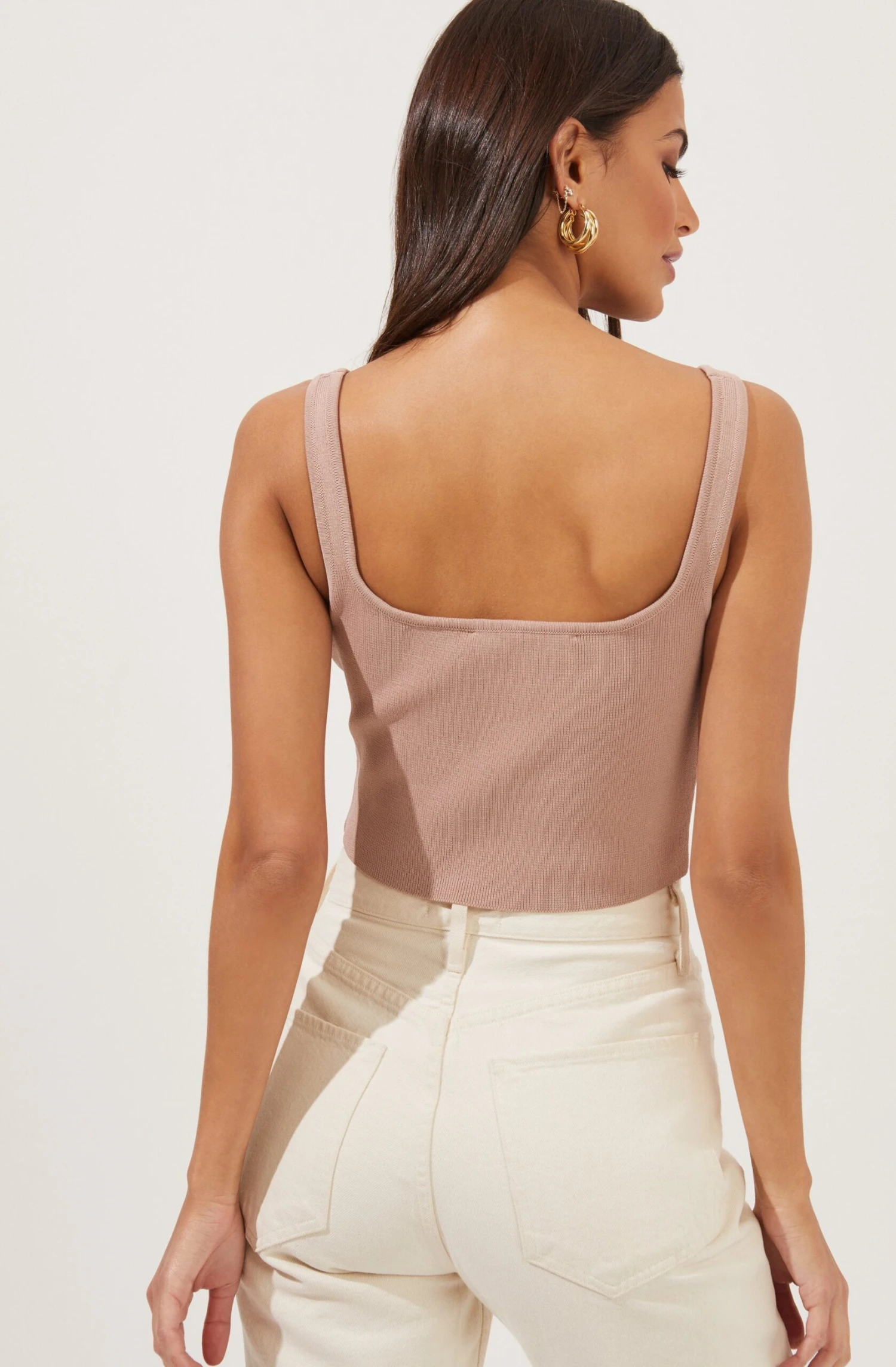 The Milano tank features a ribbed sweater knit construction. Sweetheart neckline leads to a darted bodice and cropped hem. Sleeveless.