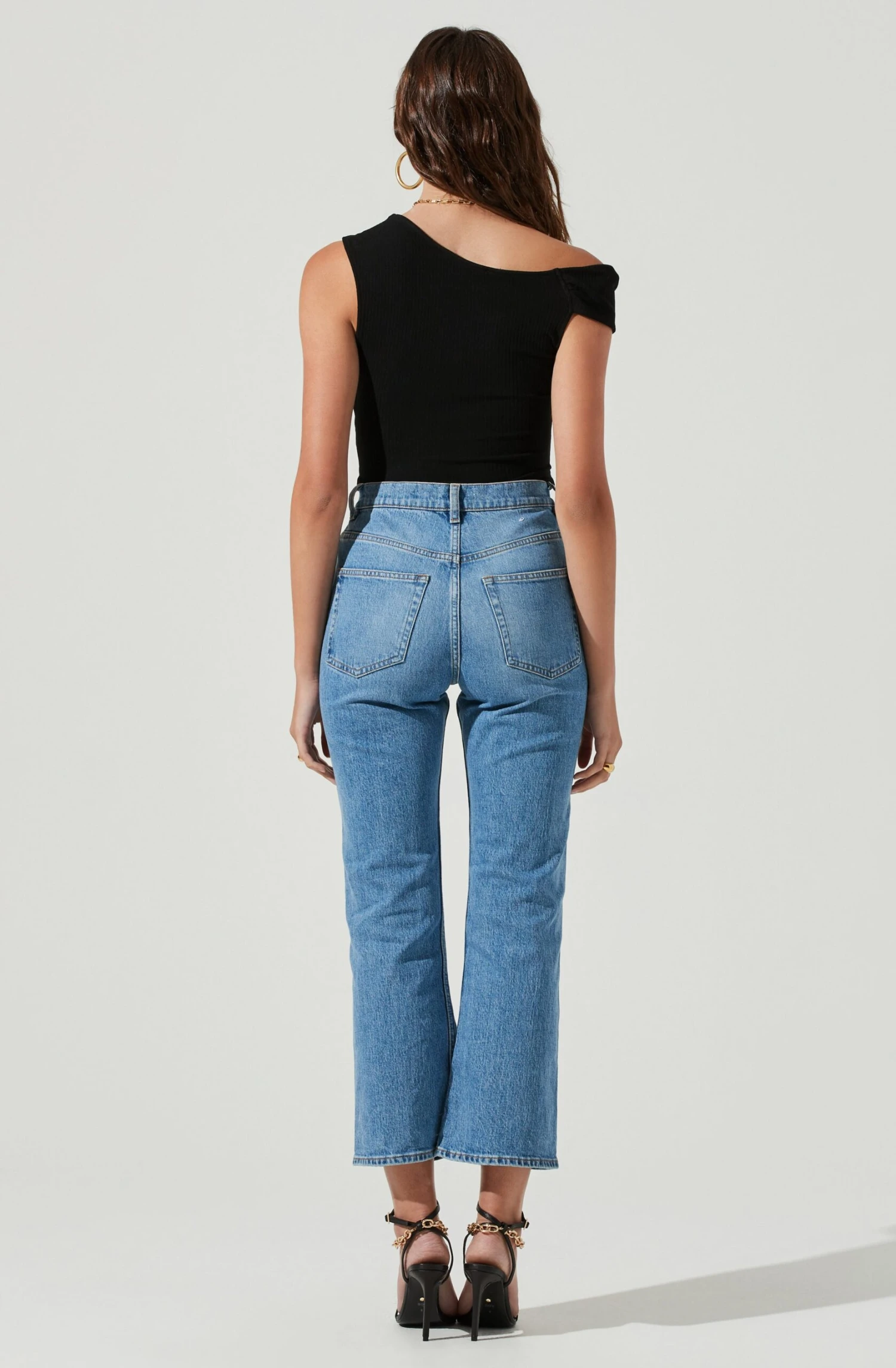 The Montrose Bodysuit features an asymmetrical, off-shoulder neckline that leads to twist front and cutout accent. Ribbed material. Attached thong bottoms have snap button closures.
