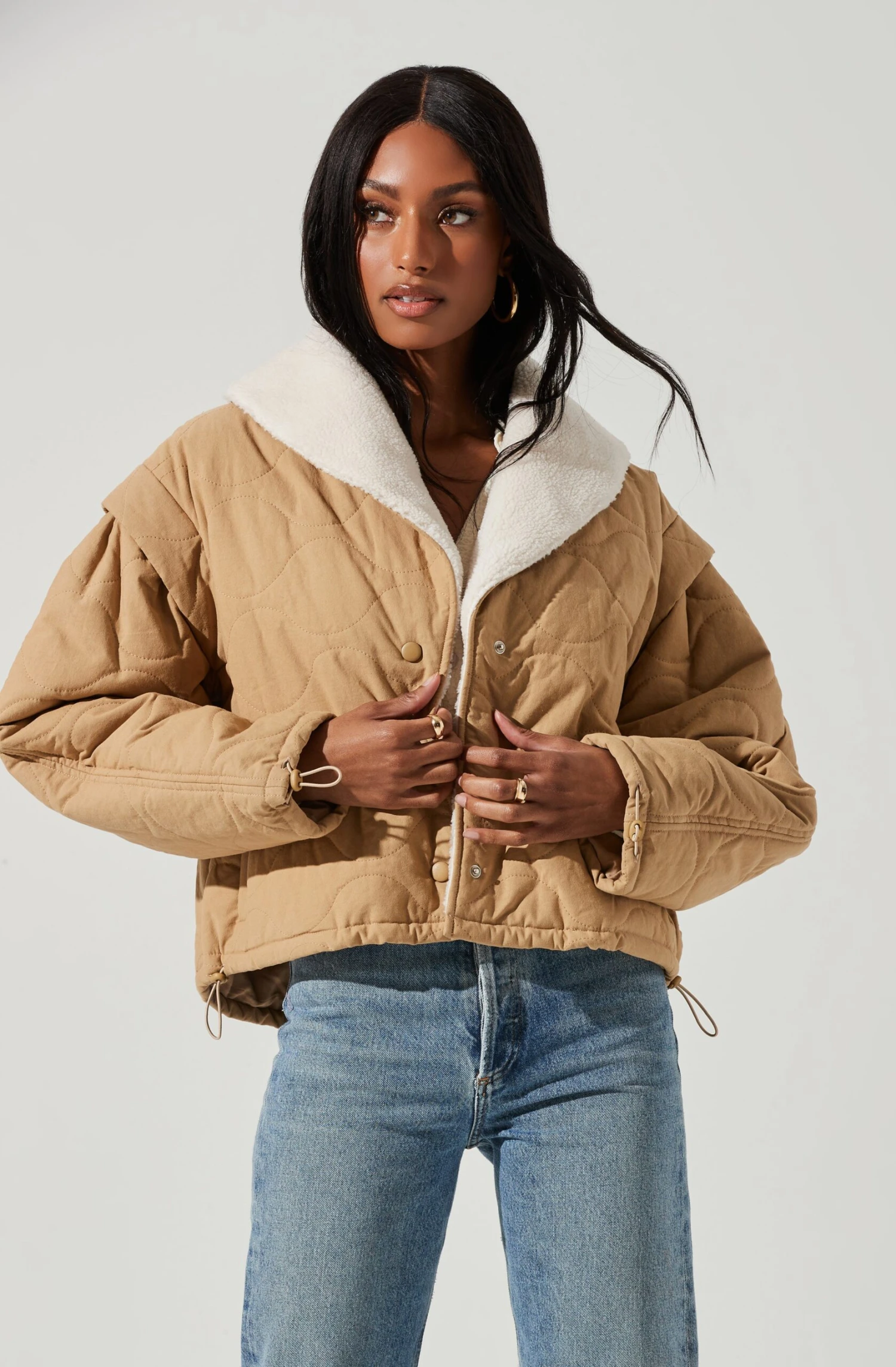 Warm up with the Nadine Jacket. It features a classic quilted design with snap button closures and faux shearling collar. Cinched detail features a drawstring accent along the waist and cuffs. Flap pockets along the sides. Long sleeves. Fully lined.