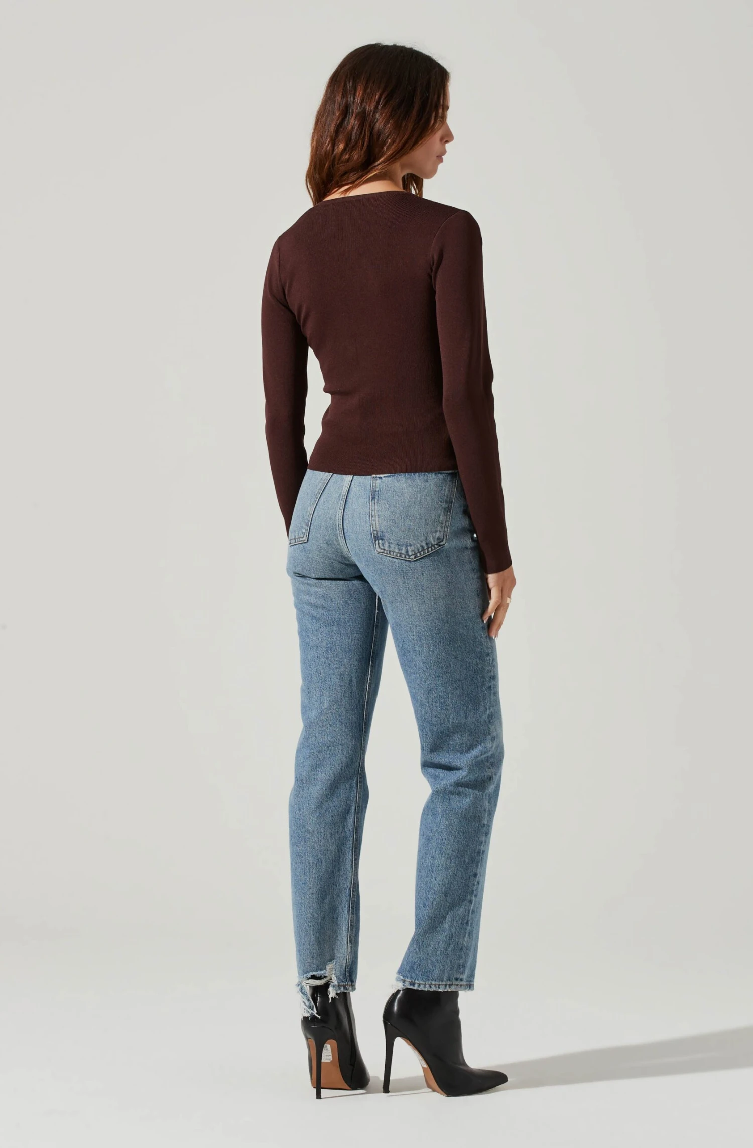 The Nella Top features a plunge neckline that leads to a cutout bust with tying drawstring accents. Long sleeves. Slight stretch.
