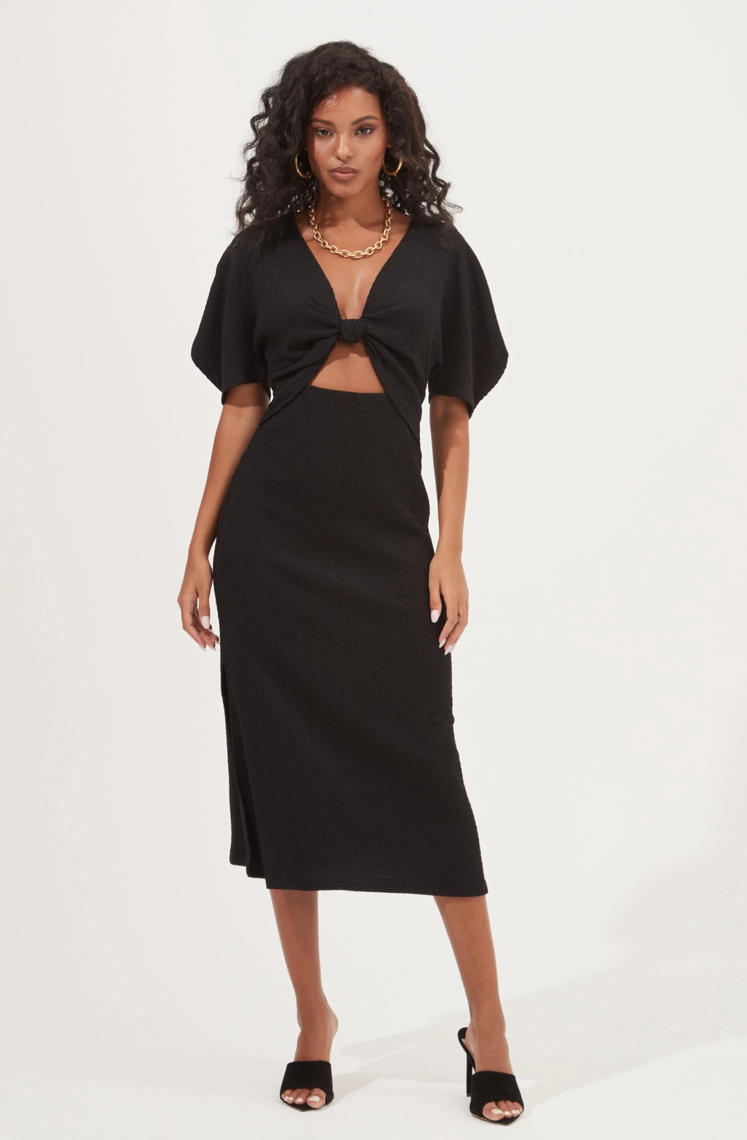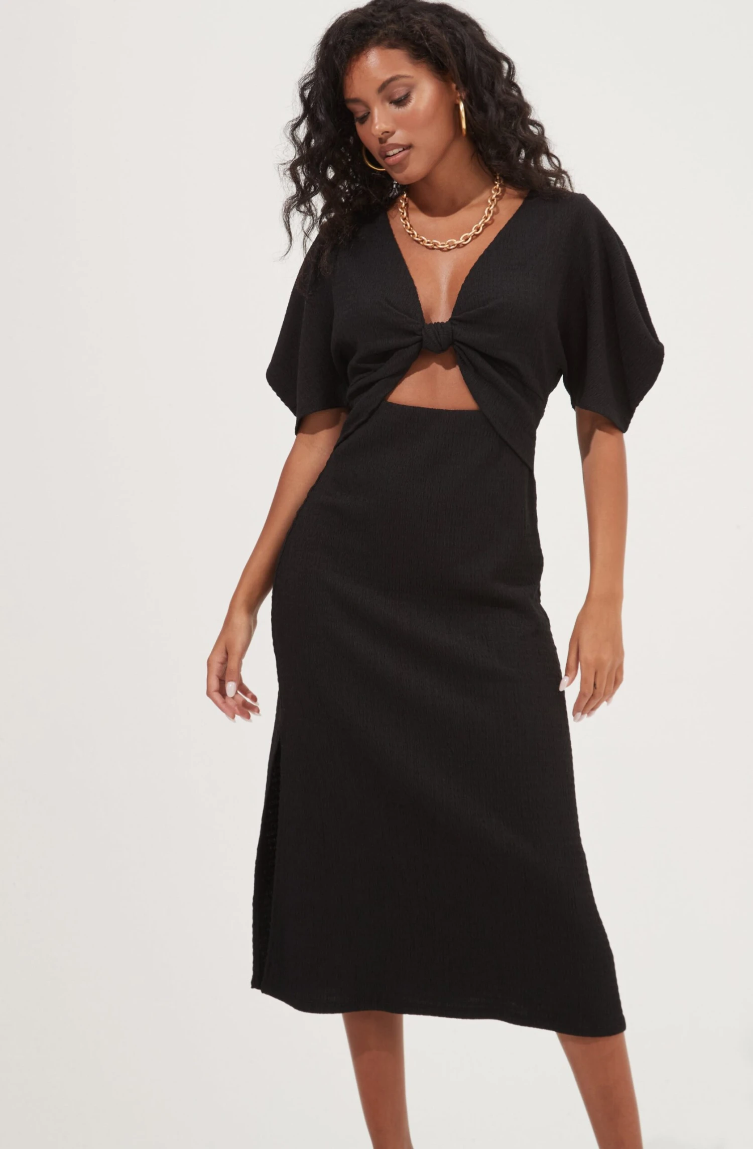 This chic dress features a plunge neckline with a front cutout accent. Short puff sleeves and open back. Midi-length skirt with a side slit accent.