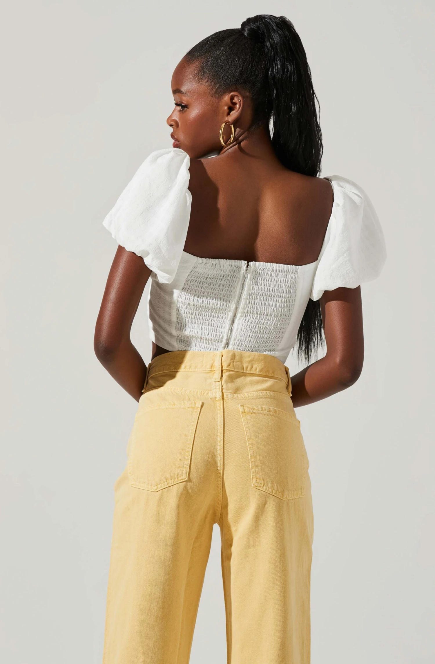 This top has a textured finish for an ultra-elevated look. Sweetheart neckline leads to a darted, corset-style, bustier bodice. Short, puff sleeves. Exposed back zip closure. Smocked back.