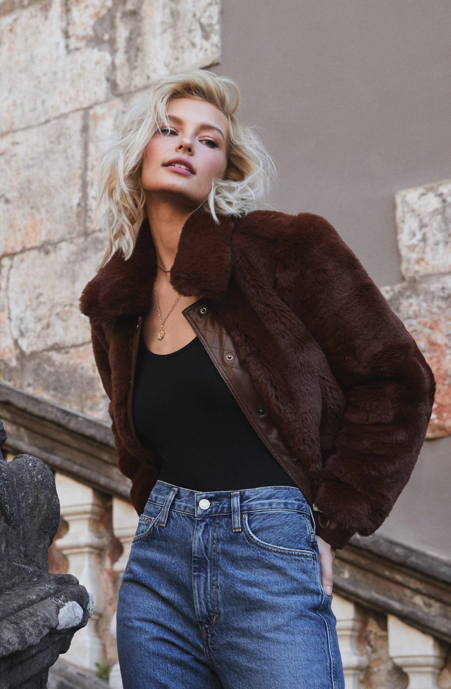 The Patricia jacket features a faux fur construction with a pointed collar, faux leather front button placket and slanted pockets at the front. Long sleeves.