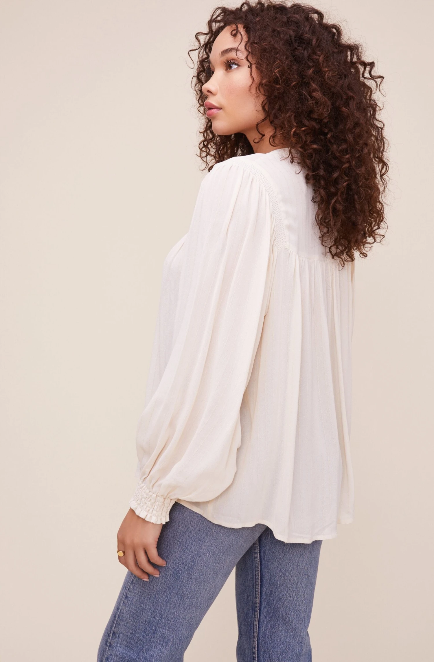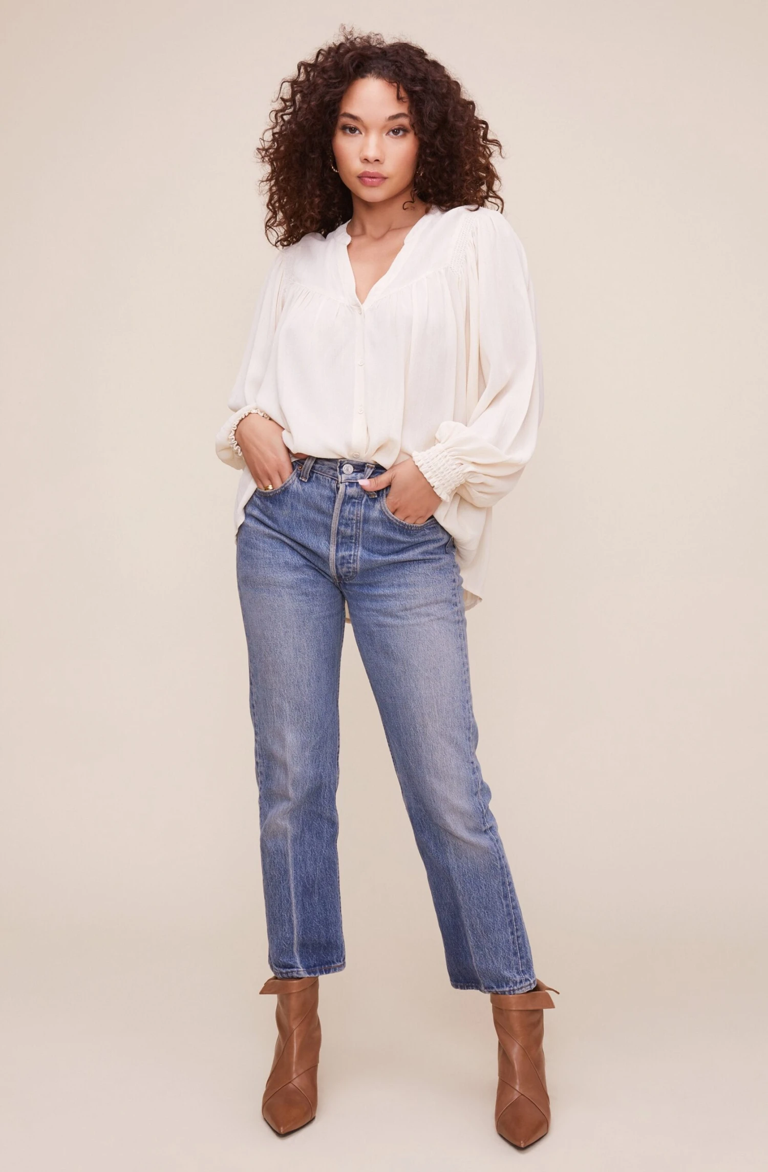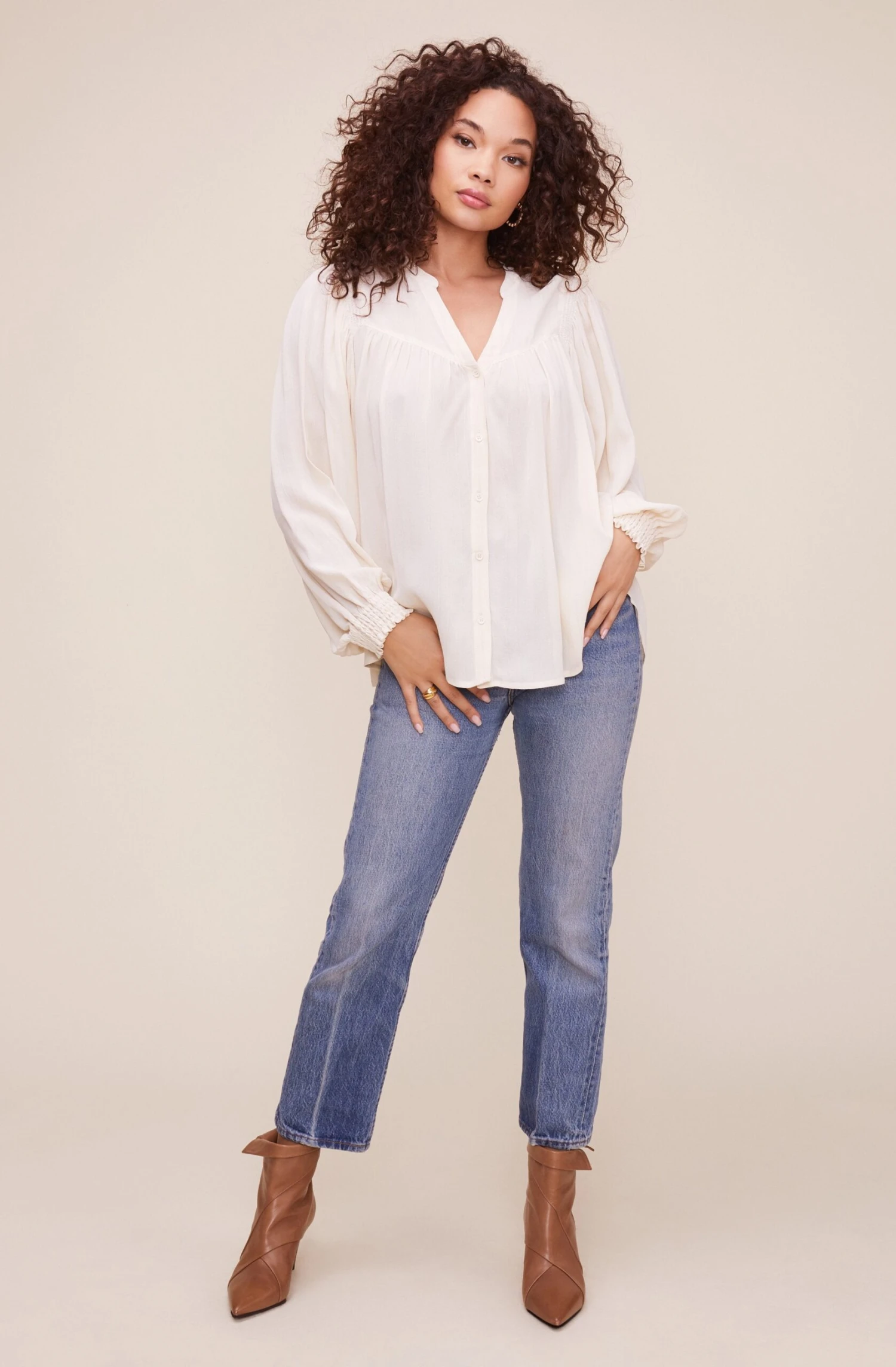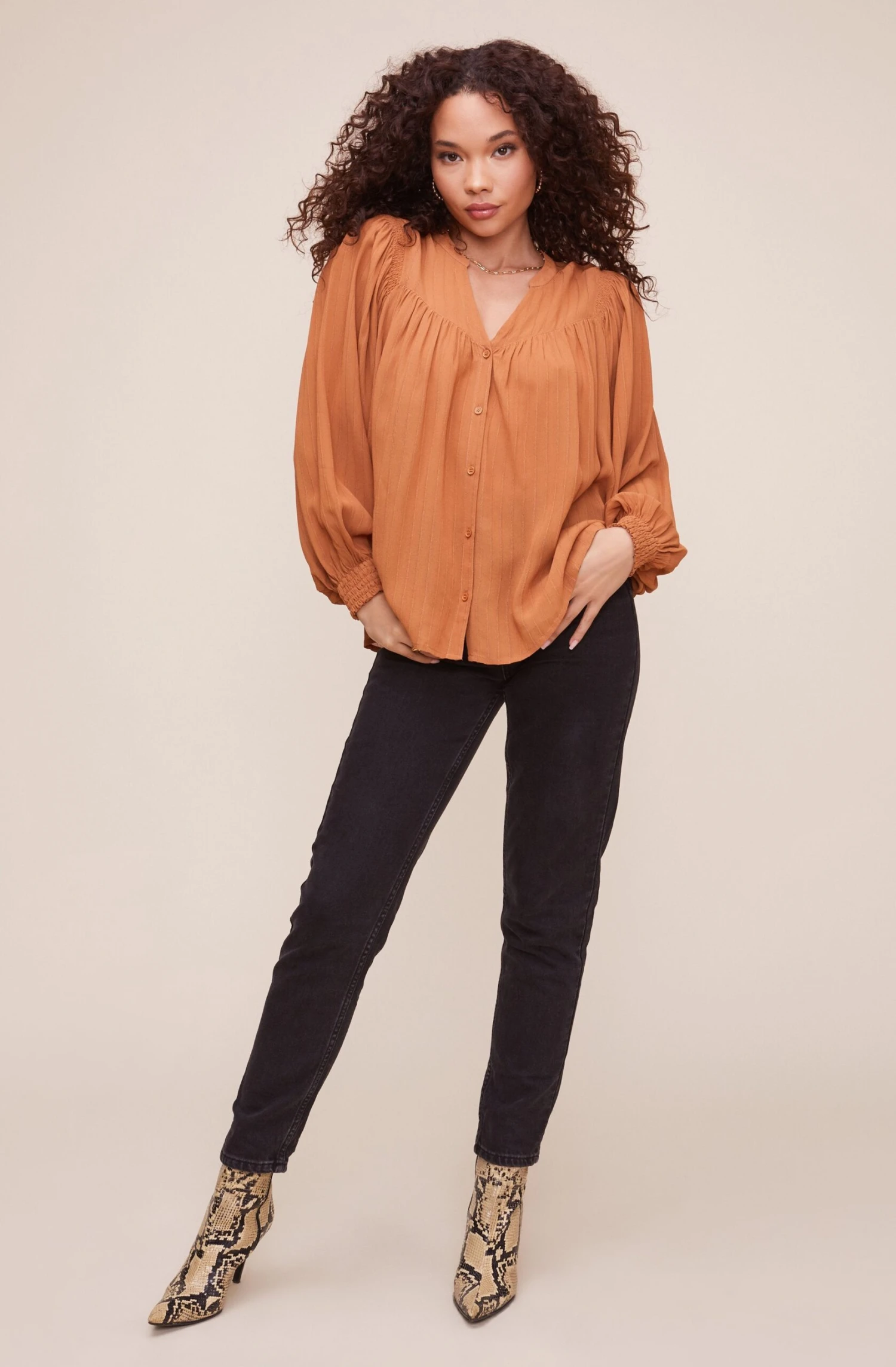 The Piper top features a V neckline that leads to a buttoned front and loose-fitted silhouette. Long sleeves.
