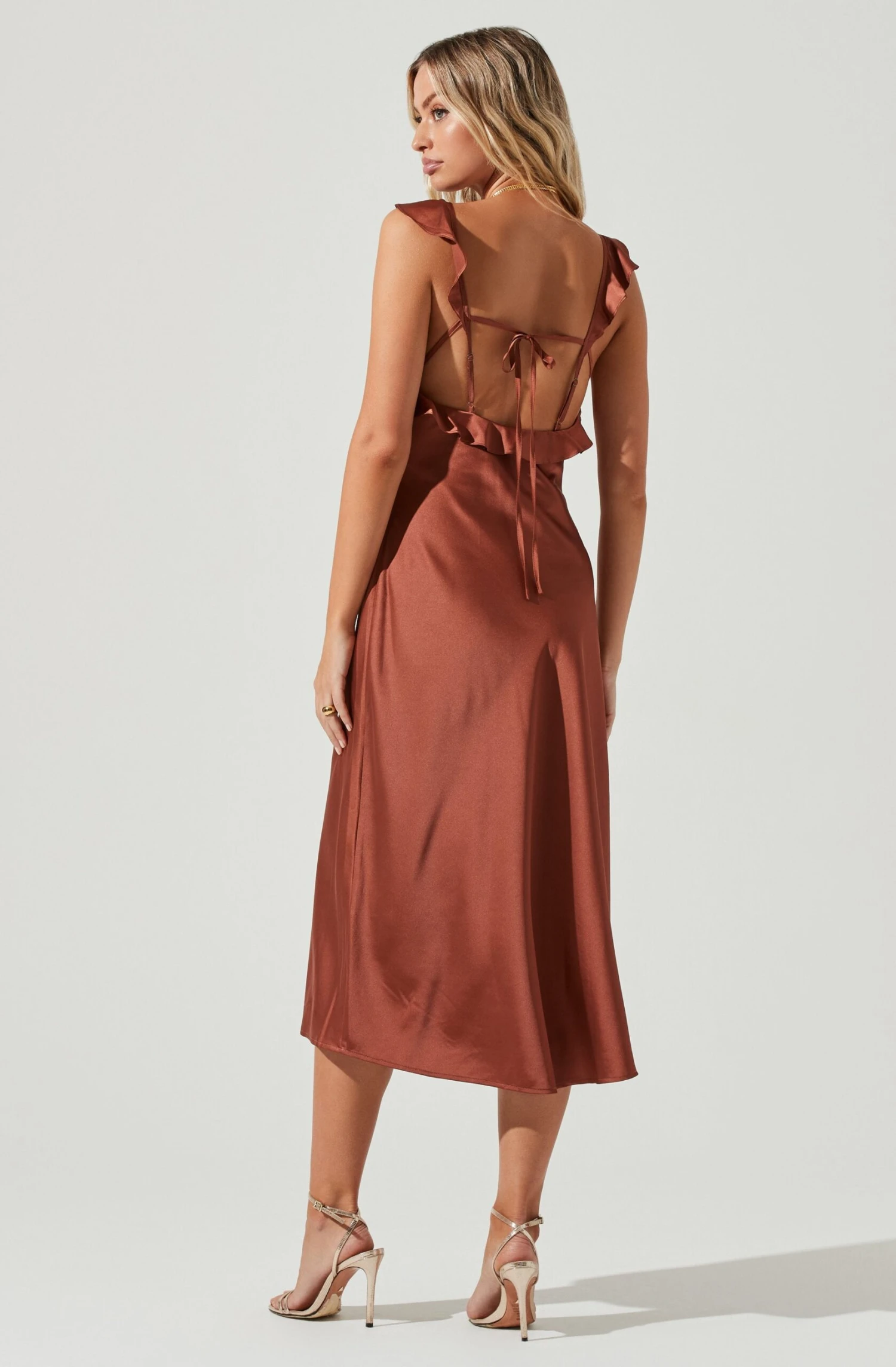 The Rina Dress features a square neckline with ruffle straps. Fitted silhouette leads to a midi-length skirt. Cutout back with tying straps.