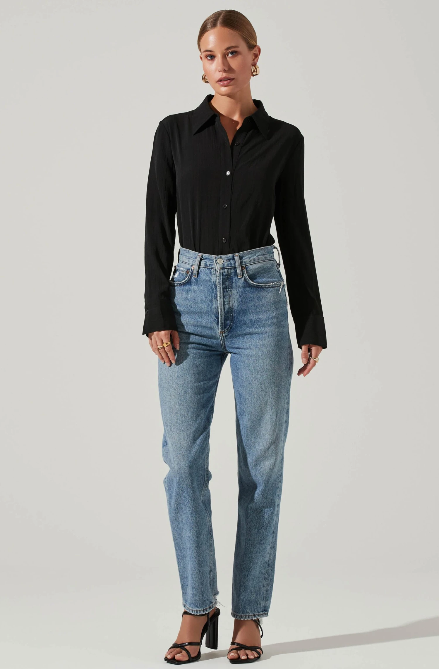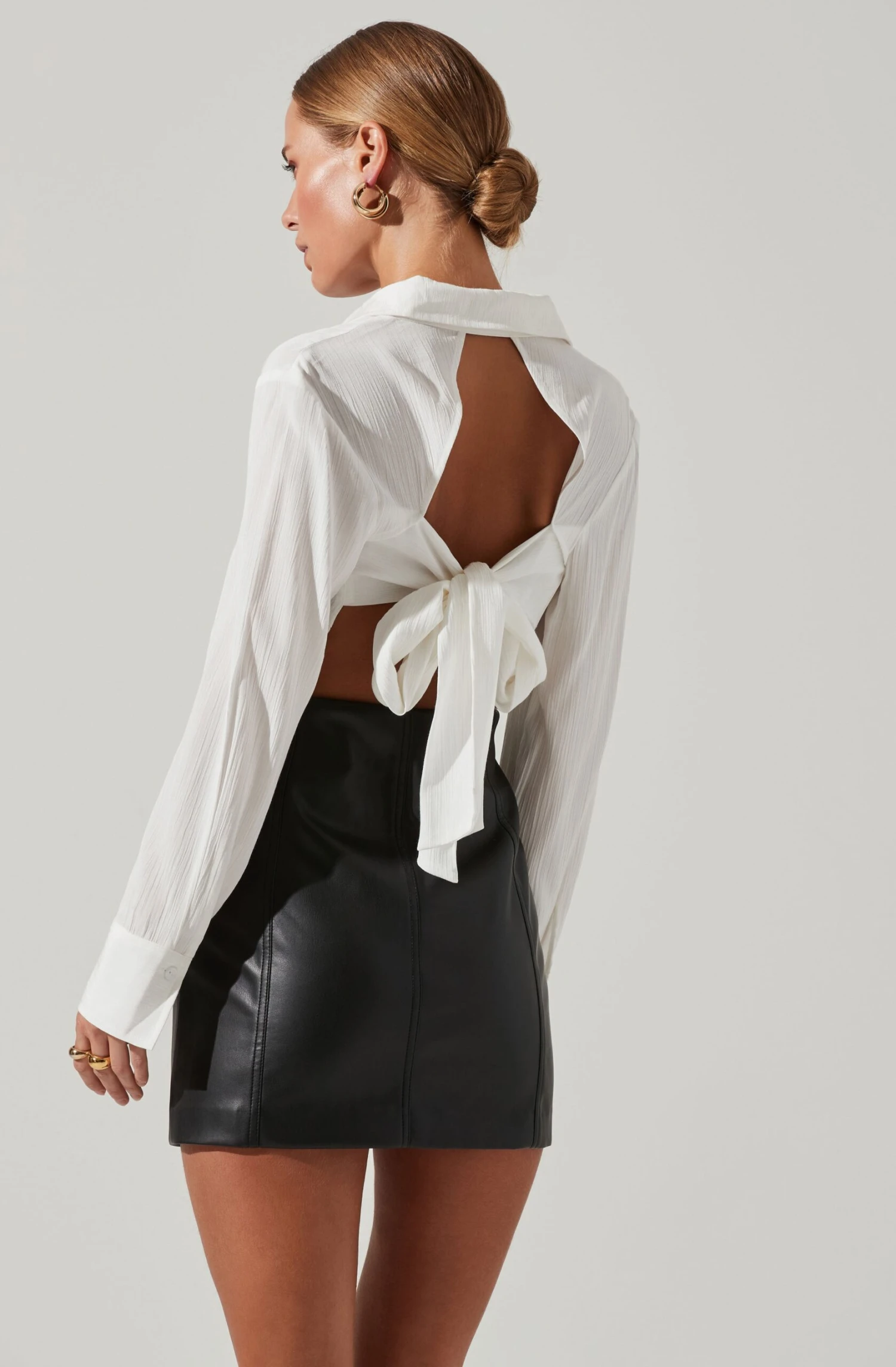 The Romilda Top features a pointed collar that leads to a buttoned front. Open back features statement tie-back straps. Long sleeves. Buttoned cuffs.