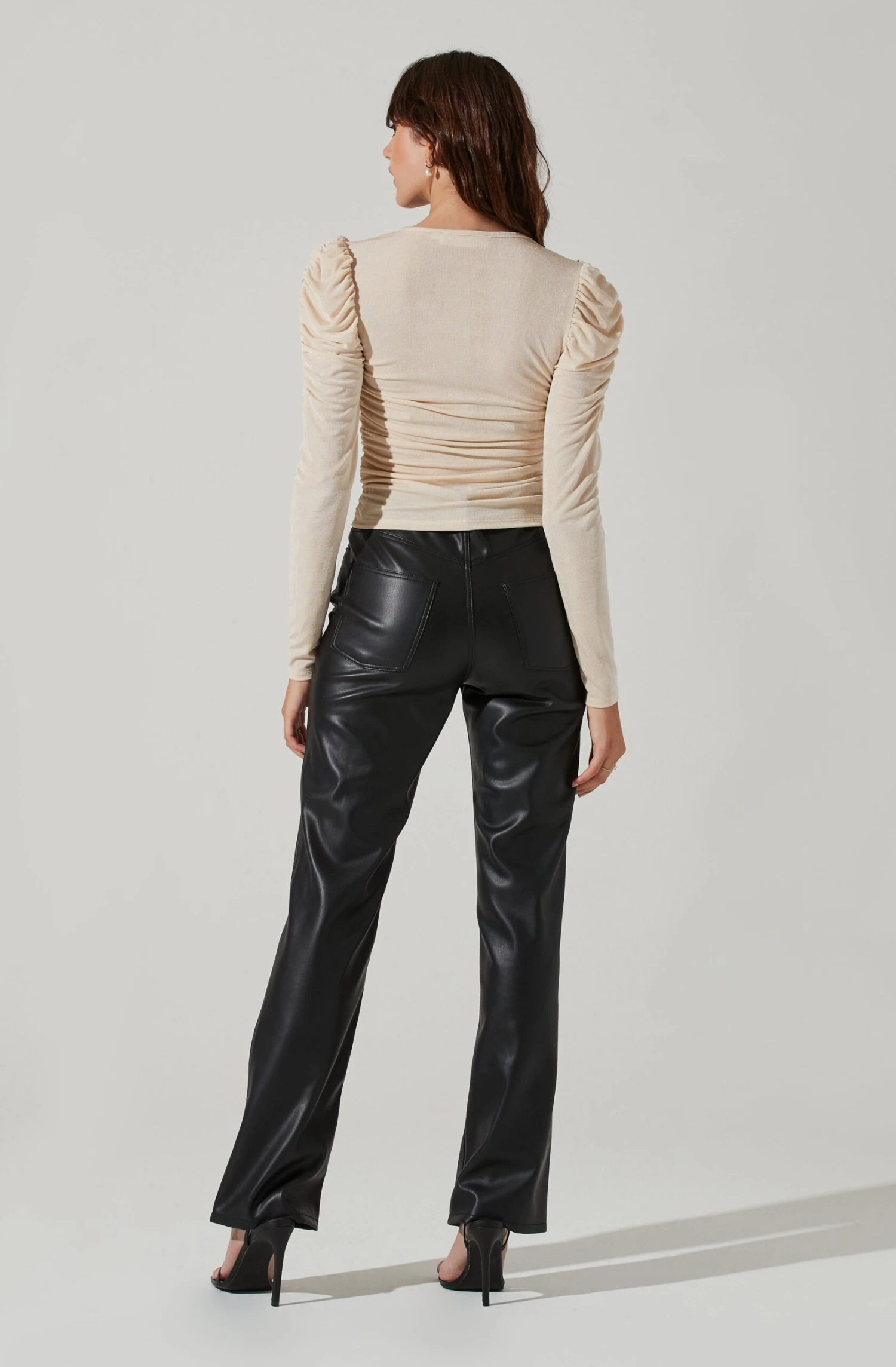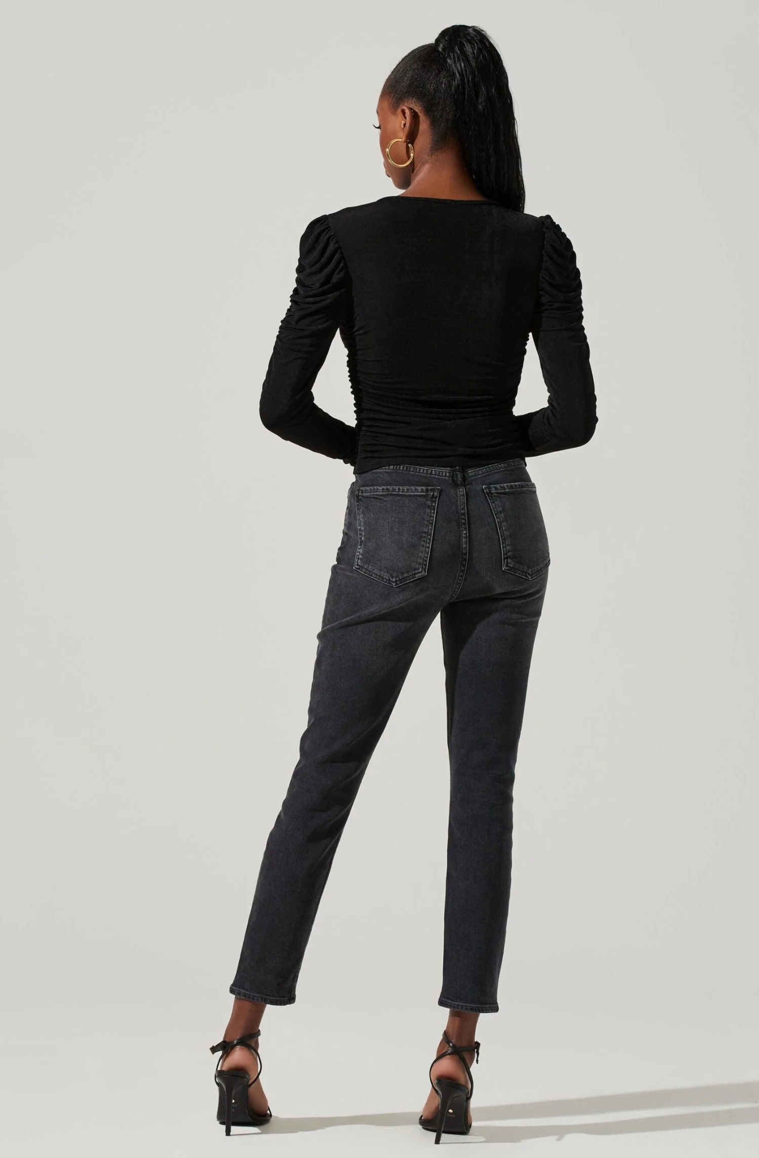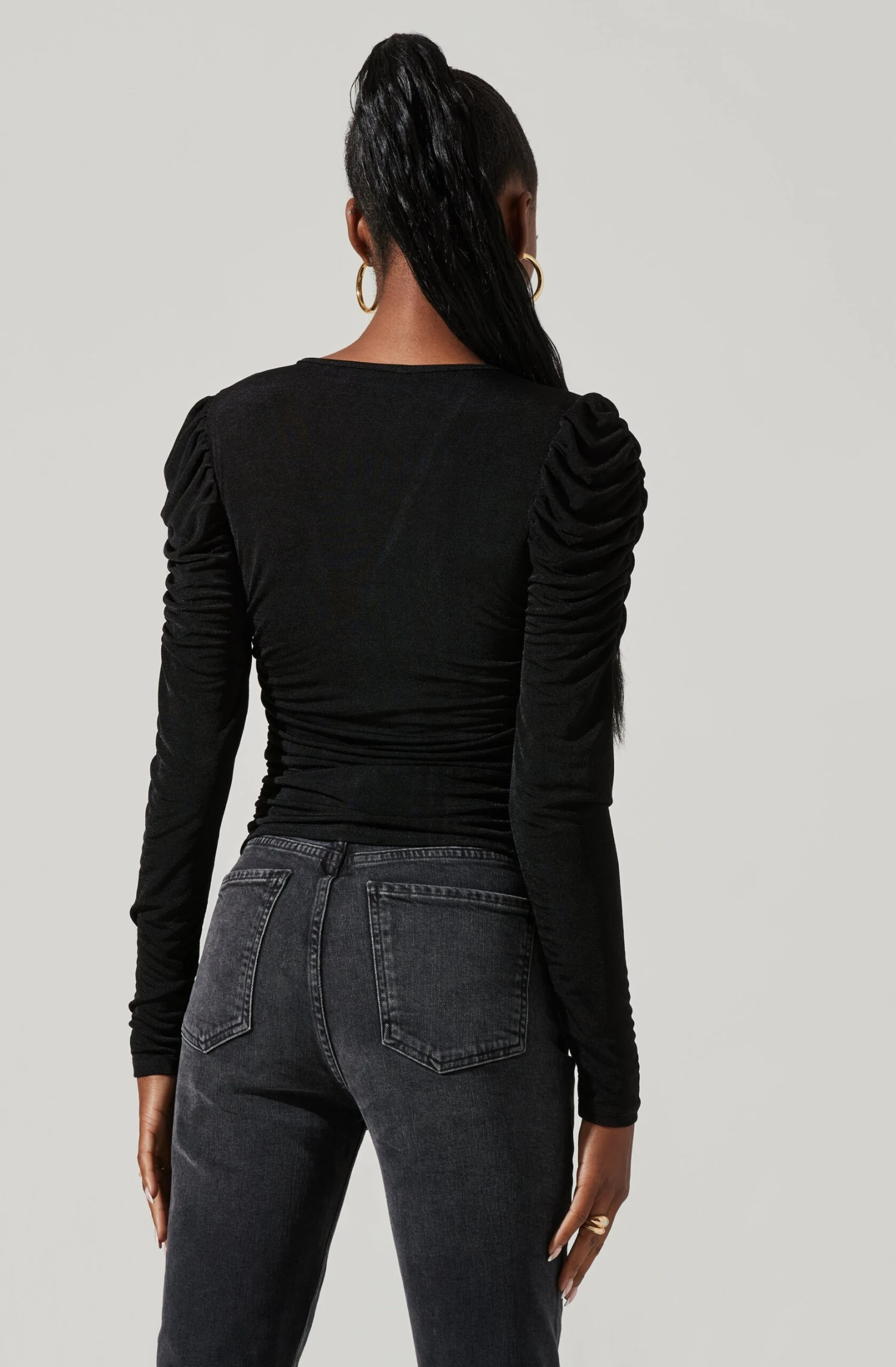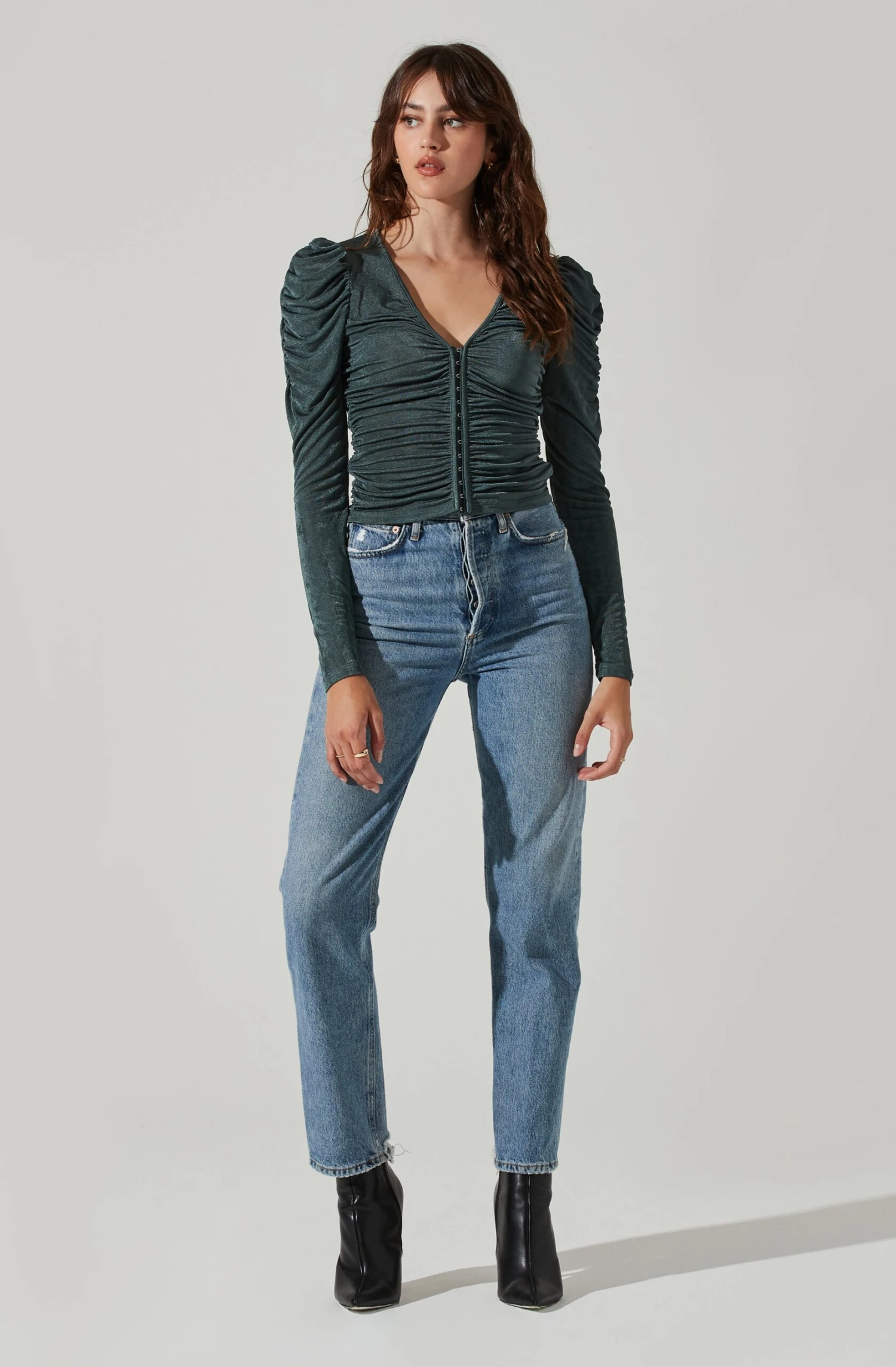 This ruched top features a plunging neckline that leads to a ruched front with a hook-and-eye closure. Long, ruched sleeves.