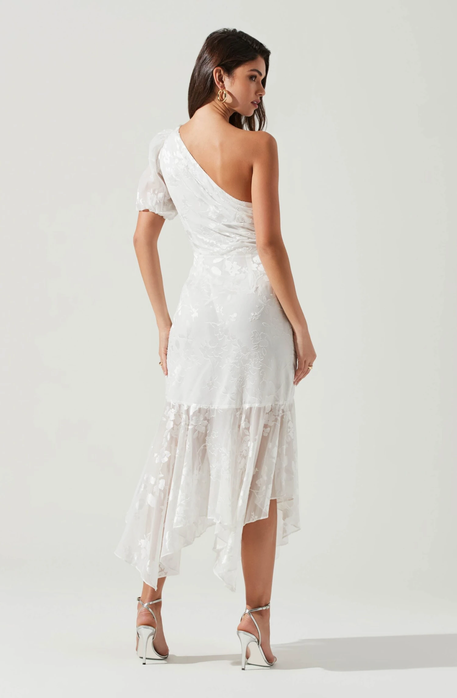 Make a statement in this silhouette! It features a one-shoulder design with a single puff sleeve. Draped bodice with a defined waist leads to a midi skirt with a handkerchief hem. Retro-inspired floral burnout print throughout.