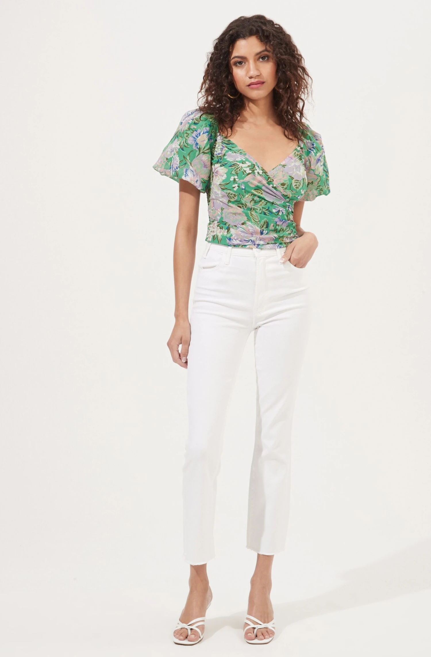 Sweet and inspiring florals, just like a poem! Featuring a deep V neckline, this style descends to a wrap front bodice. Short puff sleeves and bold floral print design throughout.
