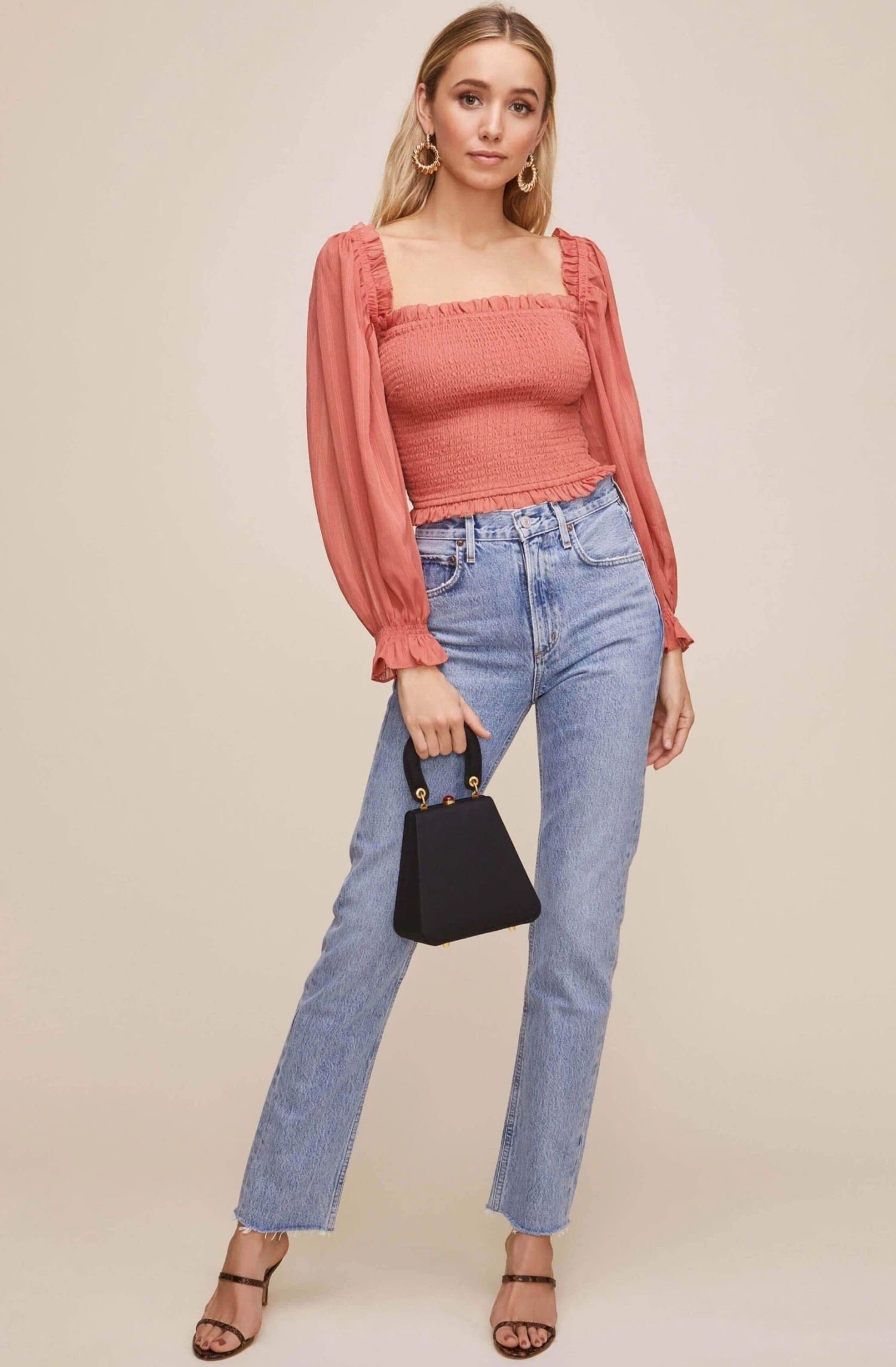 Feel the romance in the air? This crop blouse features an off-shoulder neckline that leads to long puff sleeves with a shadow stripe print. Smocked bodice and ruffle trim adds whimsy and charm!