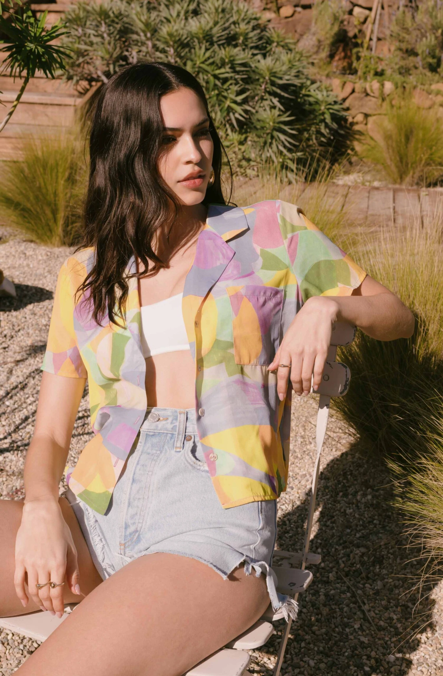 The Tourist Top features a statement abstract print throughout. Notched collar leads to a buttoned front. Short sleeves. Relaxed fit.