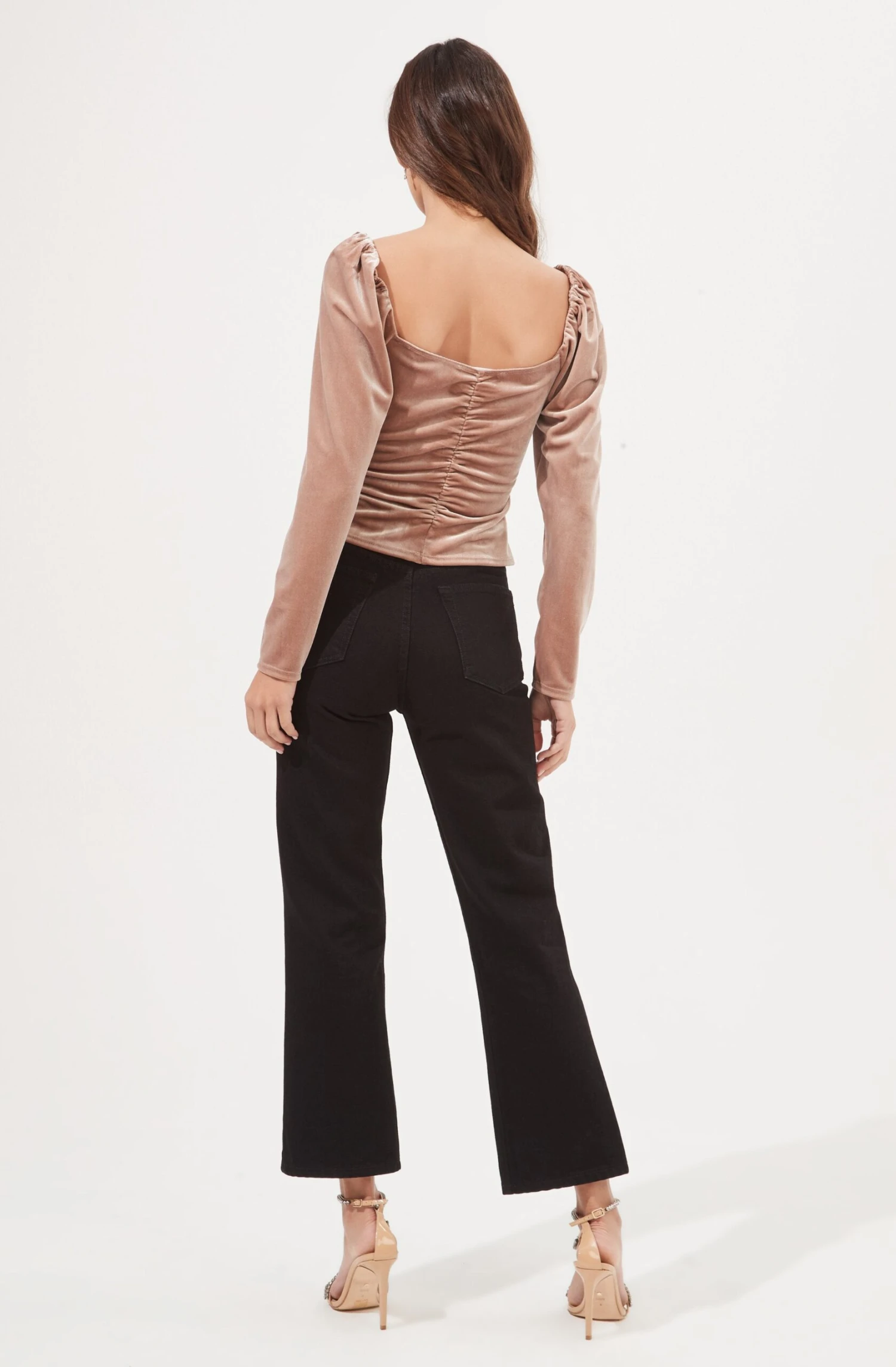 Your velvet dreams come true! The Vanya Top features a sweetheart neckline that leads to a ruched bodice. Long sleeves with padded shoulders.